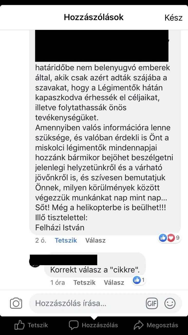 „Tisztelt Igazgató Úr! Kérem Önt, hogy a miskolci légimentőket ne használja fel kampánycéljaira és törölje kampány oldaláról ezt az utolsó bekezdésig hazug bejegyzést!!! Mi, légimentők (pilóták, orvosok, paramedikusok, műszakiak) tisztességes, hivatásunkat megszállottan szerető emberek vagyunk, és sem mi, sem pedig általunk óvott és szeretett helikopterünk nem érdemeljük meg, hogy gusztustalan, becstelen csatározások és taktikák eszközei legyünk. Amennyiben azonban mindenképpen azt gondolja, hogy valamit nyilatkoznia kell az ügyben, azt, kérem, ne hazug érdekek és erkölcstelen pártelvárások mentén tegye, és ne hagyja magát félrevezetni…” – írta Veres Pál posztjára válaszként Felházi István, a Magyar Légimentő Nonprofit Kft. részéről.