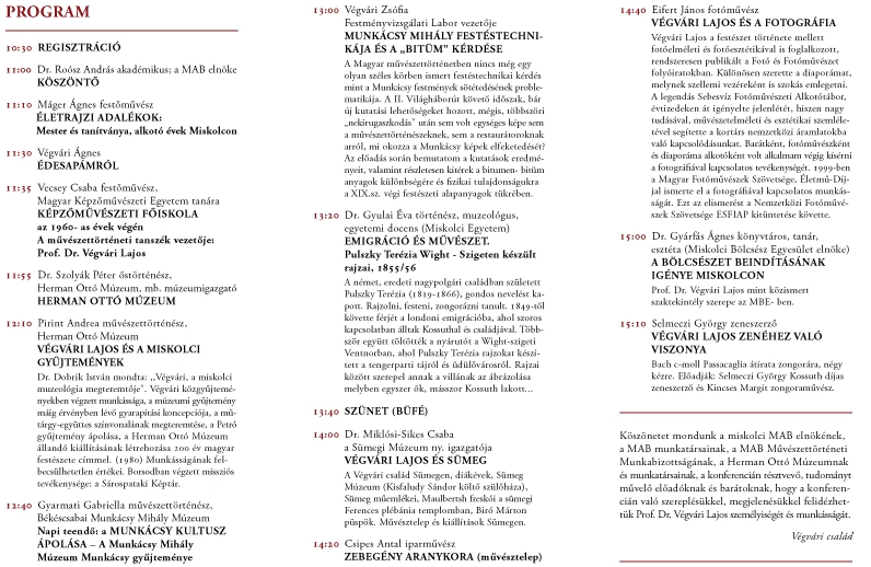 November 22-én délelőtt 11 órakor kezdődik a konferencia a Magyar Tudományos Akadémia Miskolci Akadémiai Bizottság Székházában. Roósz András akadémikus köszöntője után Máger Ágnes festőművész mond életrajzi adalékokat, majd Végvári Ágnes beszél édesapjáról.