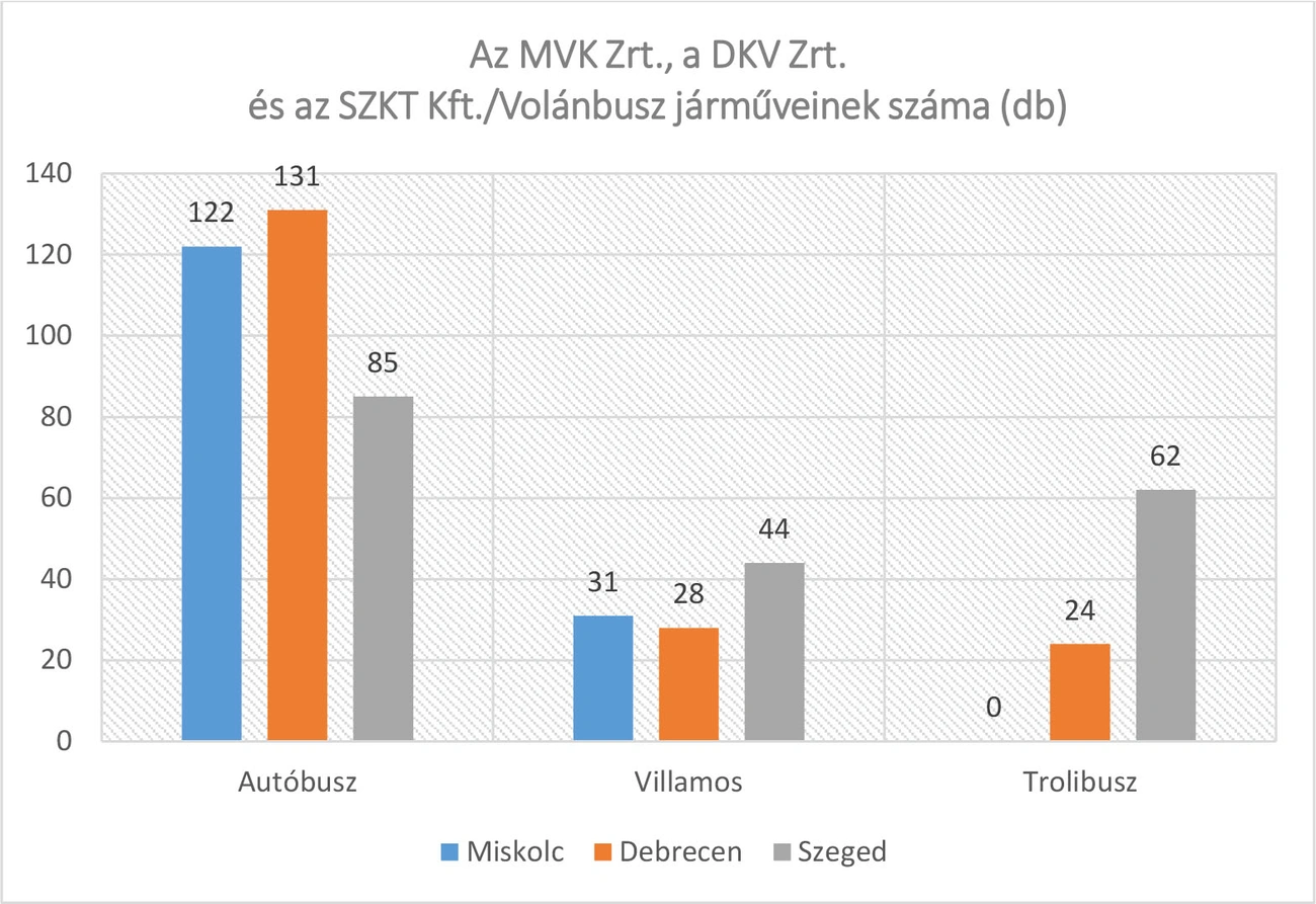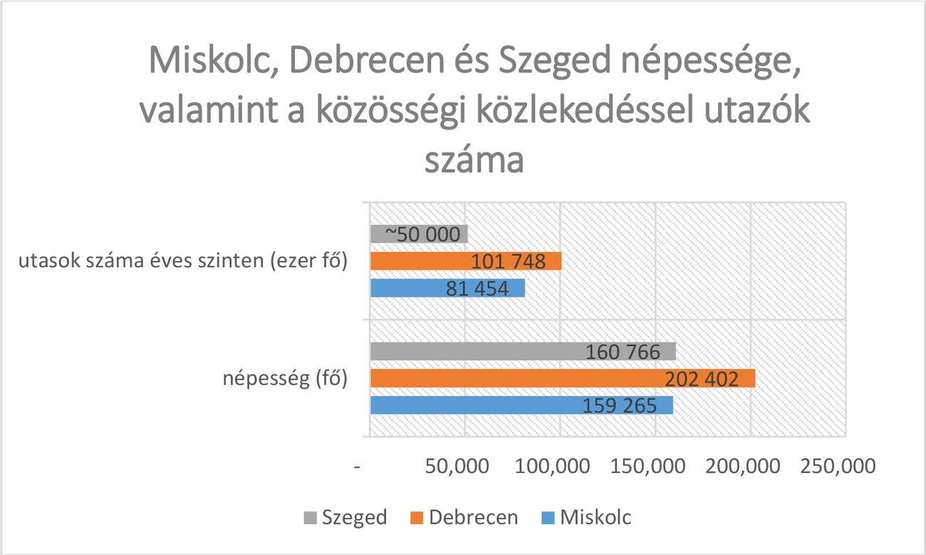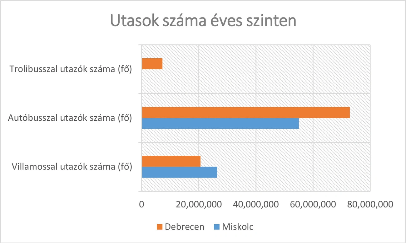Az utasszámról 2018-as adatok állnak rendelkezésre, ezek szerint Debrecenben összesen 101 millió 748 ezer fő választotta a közösségi közlekedést, legtöbben (közel 74 millióan) autóbusszal jártak, villamosra több mint 20 millióan szálltak, a trolit pedig mintegy 7 millió 300 ezren használták. Szegeden éves utasszámot a menetdíjbevétel alapján kalkulálnak, ami a teljes városi közösségi közlekedés tekintetében közel 50 millió utas. Miskolcon éves szinten több mint 80 millió utas választja a közösségi közlekedést, az autóbusszal utazók aránya 67,6 százalék, a villamossal utazóké 32,4 százalék.