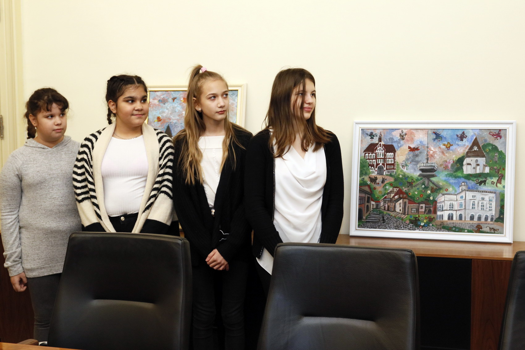 Ünnepélyes keretek között adták át a fiatal alkotók és tanáraik a képeket Miskolc alpolgármesterének, Varga Andreának és Veres Pál polgármesternek a városháza tárgyalójában.