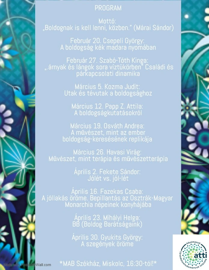 Az egészen április végéig, heti rendszerességgel jelentkező sorozatnak az „Élet-öröm – Előadások és mesék mindennapi betevő örömeinkről” címet adta a szervező Miskolci Egyetem Bölcsészettudományi Kar Alkalmazott Társadalomtudományok Intézete (ATTI) és a MAB Szociológiai Munkabizottsága.