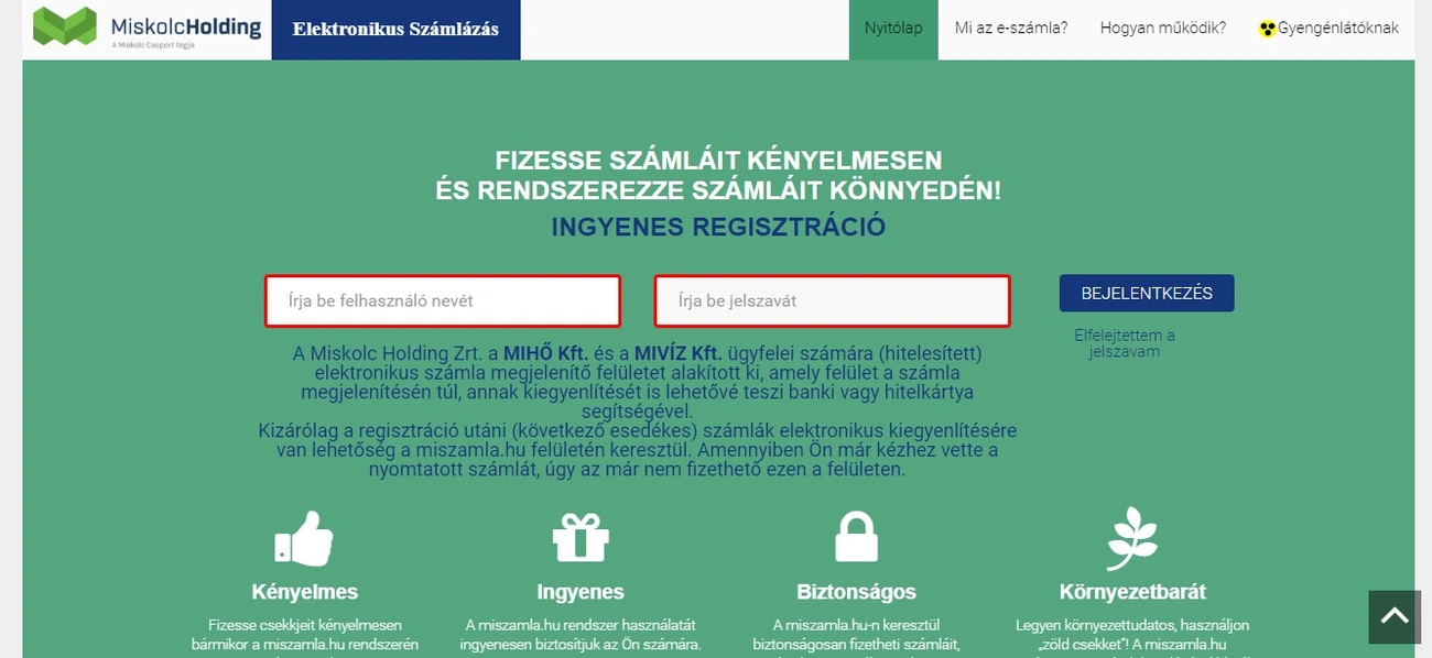 Az oldalon keresztül az ügyfelek biztonságosan fizethetik számláikat, miközben személyes adataik is bankszintű védelmet élveznek. A miszamla.hu rendszer használata ingyenes a webes felületen regisztrált ügyfelek számára. Részletes információk és regisztráció: www.miszamla.hu
