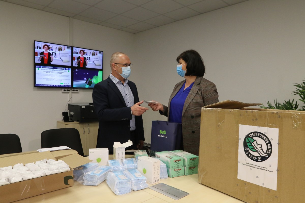 A most átadott csomagot egyébként egy Kínában élő, de magyar civil szervezettől kapta az önkormányzat – a Sporttal a Környezetért Egyesület vezetője egyébként miskolci származású. Mintegy 400 darab 3 rétegű, egészségügyi orvosi szájmaszk, 240 darab KN 95 típusú, magasabb védelmi fokozatot jelentő orvosi védőmaszk, 500 gumikesztyű, valamint 80 doboz vitamin volt a dobozban. Az adomány mellett Veres Pál polgármester személyesen a rendészekhez szóló levelét, és jókívánságait is tolmácsolta Varga Andrea.