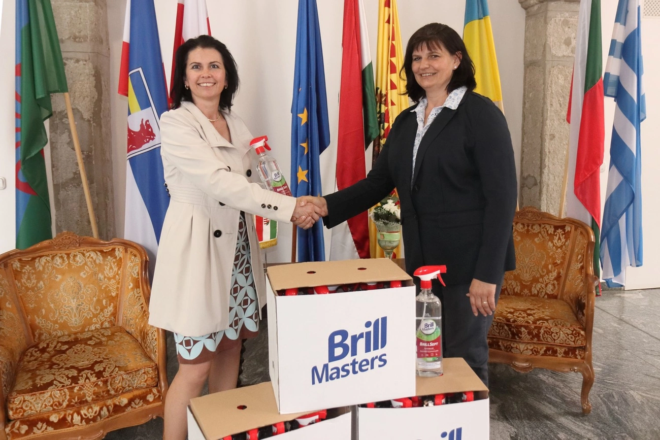 Két raklapnyi, vírusölő hatású fertőtlenítőszert adott át a BrillMasters Hungary Zrt. Miskolc önkormányzatának pénteken. A cég már korábban is tett hasonló felajánlást, az akkor adományozott tisztítószereket a miskolci idősellátásban használták fel a szakemberek a vírusveszély idején.