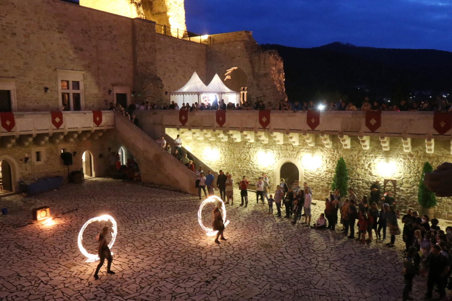 A vár termei mellett a Felső várudvar is megtelt élettel. Harcedzett lovagok idézték föl a csaták vérzivatarát, majd megvívtak egy hölgy kegyeiért, a tűzszelídítők pedig szerelmi tűztánccal kápráztatták el a közönséget.