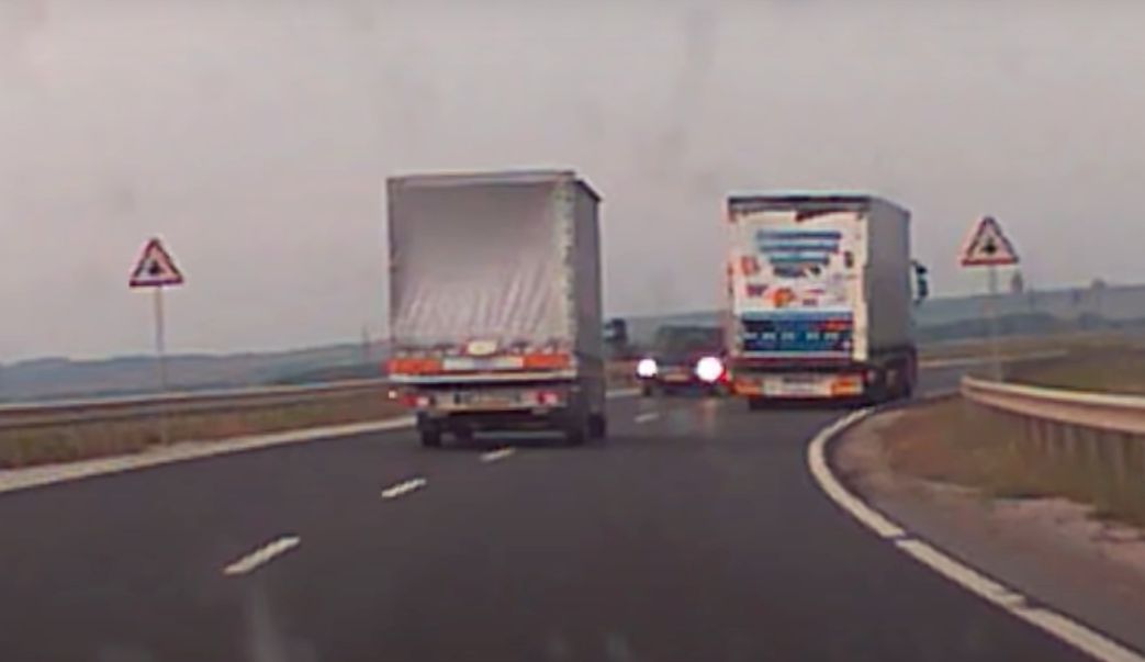 Egy nehezen belátható kanyarban szerette volna előzni a kamiont a kisteherautó, sávváltásnál azonban szemből jött egy személyautó, melynek sofőrje csak a padkára lehúzódva – meg óriási szerencsével, persze – elkerülte a balesetet.