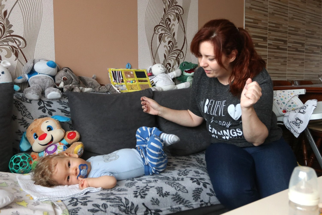 Maszk fel, kézmosás és -fertőtlenítés a lakásba belépésnél. Az apuka még dolgozik, Szabina vezet be minket a nappaliba, a kisfiú itt tölti éppen ebéd utáni pihenését. Nem fog megijedni a maszkos idegenektől? – kérdezzük az anyukától. „Abszolút nem, már hozzászokott az orvosok miatt”, feleli. Folyamatosan járnak vele gyógytornára Miskolcra, rendszeresen Budára gyógytornára, és persze ott vannak a Spinraza-kezelések is.