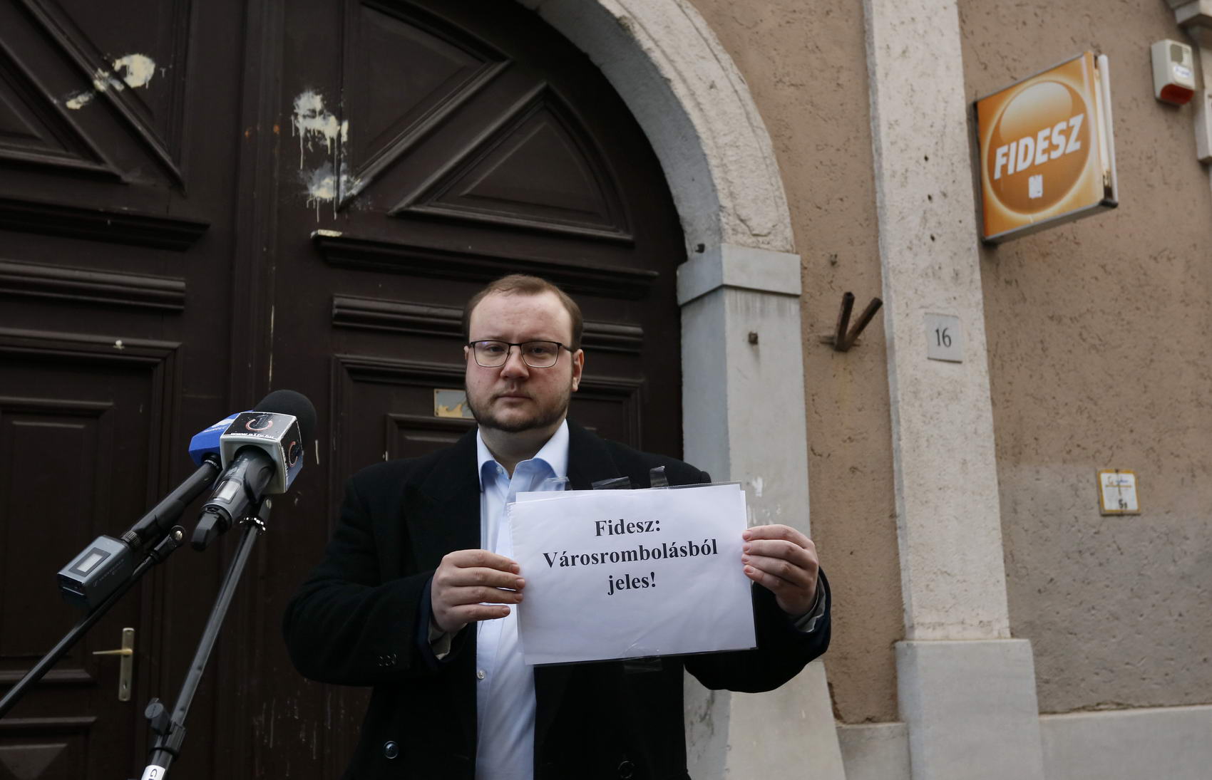 A Fidesz helyi politikusainak üzent a Velünk a Város jobbikos frakciócsoportjának önkormányzati képviselője: a kormánypárt Kossuth utcai irodájának kapujára egy papírt ragasztott ki keddi sajtótájékoztatója alkalmával Szilágyi Szabolcs. A papíron ez áll: „Fidesz: városrombolásból jeles!”.