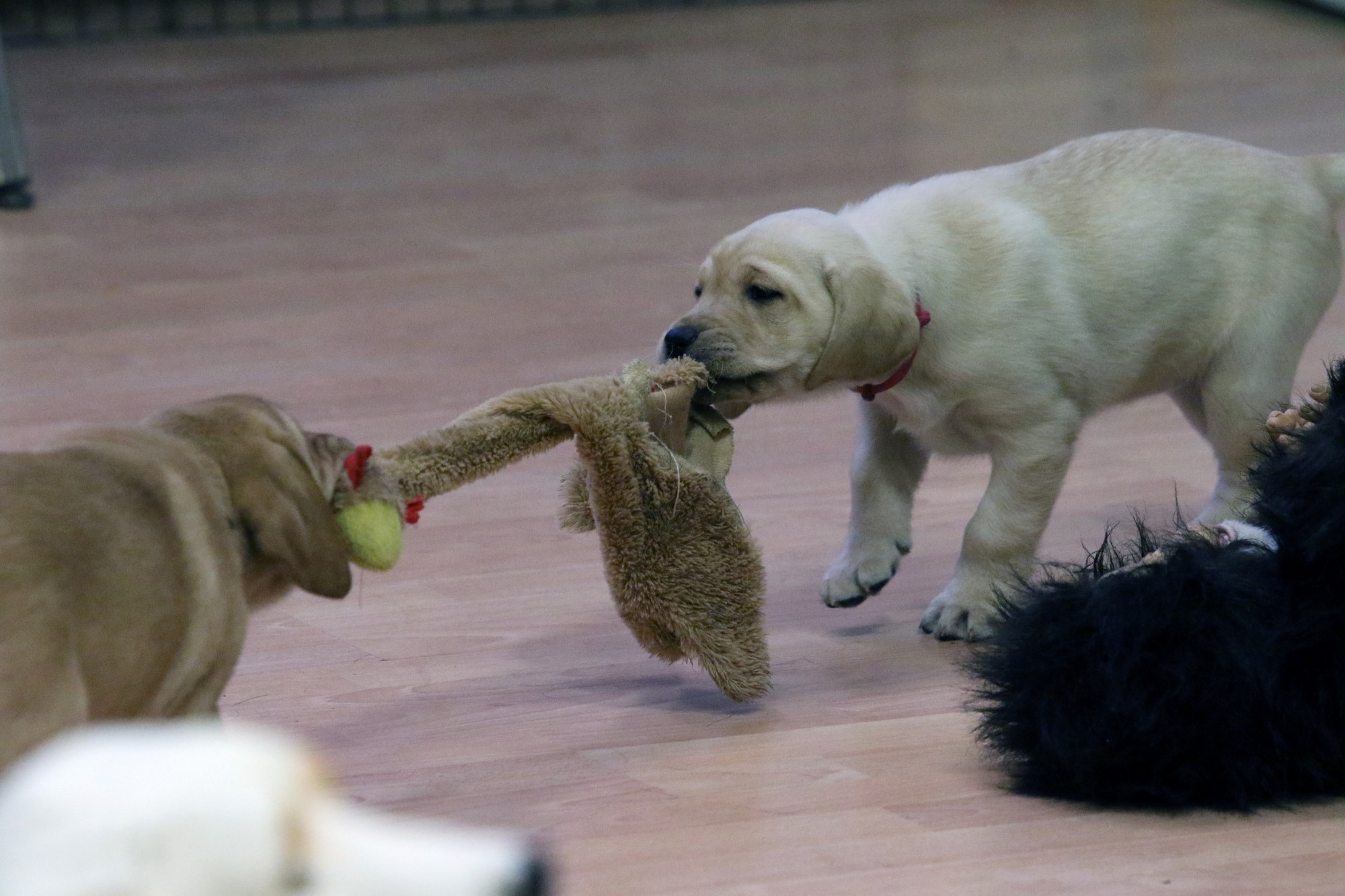 Piros szalag van a nyakában a második kölyöknek. Az eléggé visszahúzódó, nyugis, csendes kis szuka a Szamóca nevet kapta.