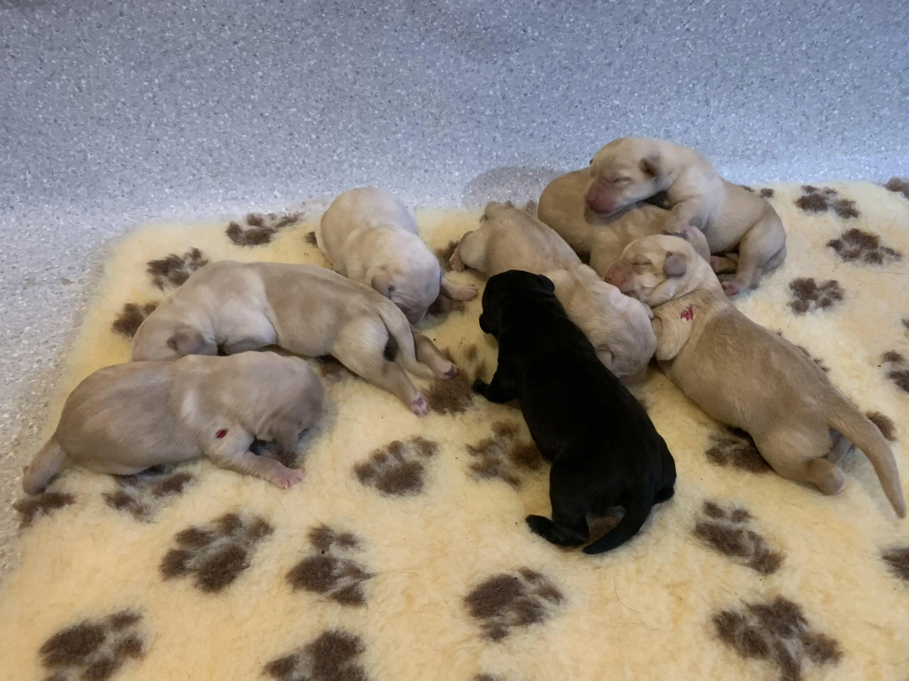 7 sárga és 1 fekete kölyök született. Az 5 szuka és 3 kan egészséges, életrevaló, sokat esznek és alszanak. Viszonylag gyorsan megszületett 7 kölyök, azután Calgary „rápihent” az utolsóra, aki a legnagyobb lett a testvérek között. Ideális súllyal, 40-50 dkg között születtek. Az anyakutya elfáradt és jól érzi magát a csöppségekkel. Az alom Veresegyházon látta meg a napvilágot.