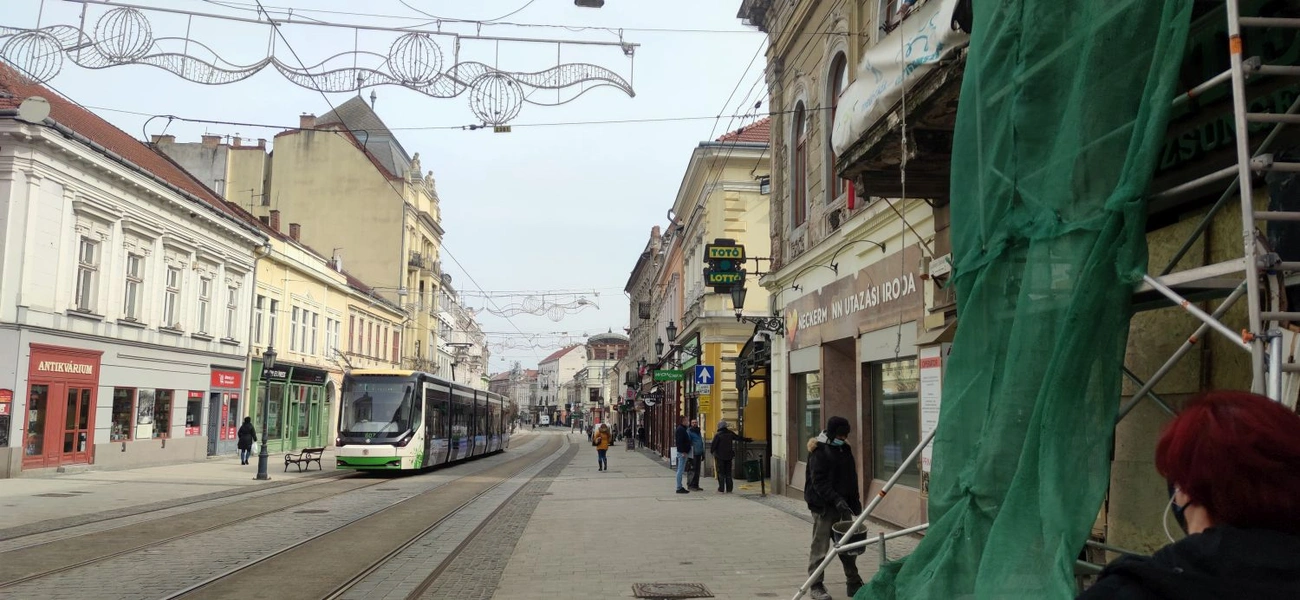 A belváros kezdetét jelentő térről indulunk el, hogy utánajárjunk a vélt igazságnak, miszerint alig van élet a megyeszékhely központjában, a városlakók zöme otthon marad, home office-ban dolgozik, aki tud, és mindenki más is kerüli, hogy a köztereken tömegekkel találkozzon: jobb az óvatosság az idestova egy esztendős koronavírus-fenyegetettség hullámzó állapotában. Nos, tömegekkel nemigen lehet találkozni a Széchenyi utcán, még a legfrekventáltabb pontokon is alig – később, már a Corvin-kereszteződésben látunk egyszerre nyolc gyalogost a zebrán, amennyiben ez „tömegnek” nevezhető. De még csak a városház térnél járunk riportkörutunkon: vajon „tömegnyomor” érzékelhető-e a villamosokon? Az épp a megállóba érkező szerelvényen nem látszik ilyesmi, akad bőven ülőhely, a többség azokon foglal helyet, kevesebben vannak, akik állnak, bár leülhetnének, ez az ablakokon át is kivehető. Mintegy tucatnyian szállnak le- és fel. A közelben pékség, gyrosos, sütibolt, cukrászda, egyik üres, másik zárva, ennyi a változatosság a kereskedelmi látképben. Az élelmiszer-áruház bejáratánál néhány maszkot viselő vásárló mozog kifelé és befelé, az ablakmosó is végzi munkáját, akárcsak valamivel lejjebb, a színházzal szemben egy ház homlokzatfelújításán dolgozók. Messzire harsan az állványról a „Vigyázzatok!” kiáltás, ahogy emelik fel az építőanyagot az emeleti erkélyhez.