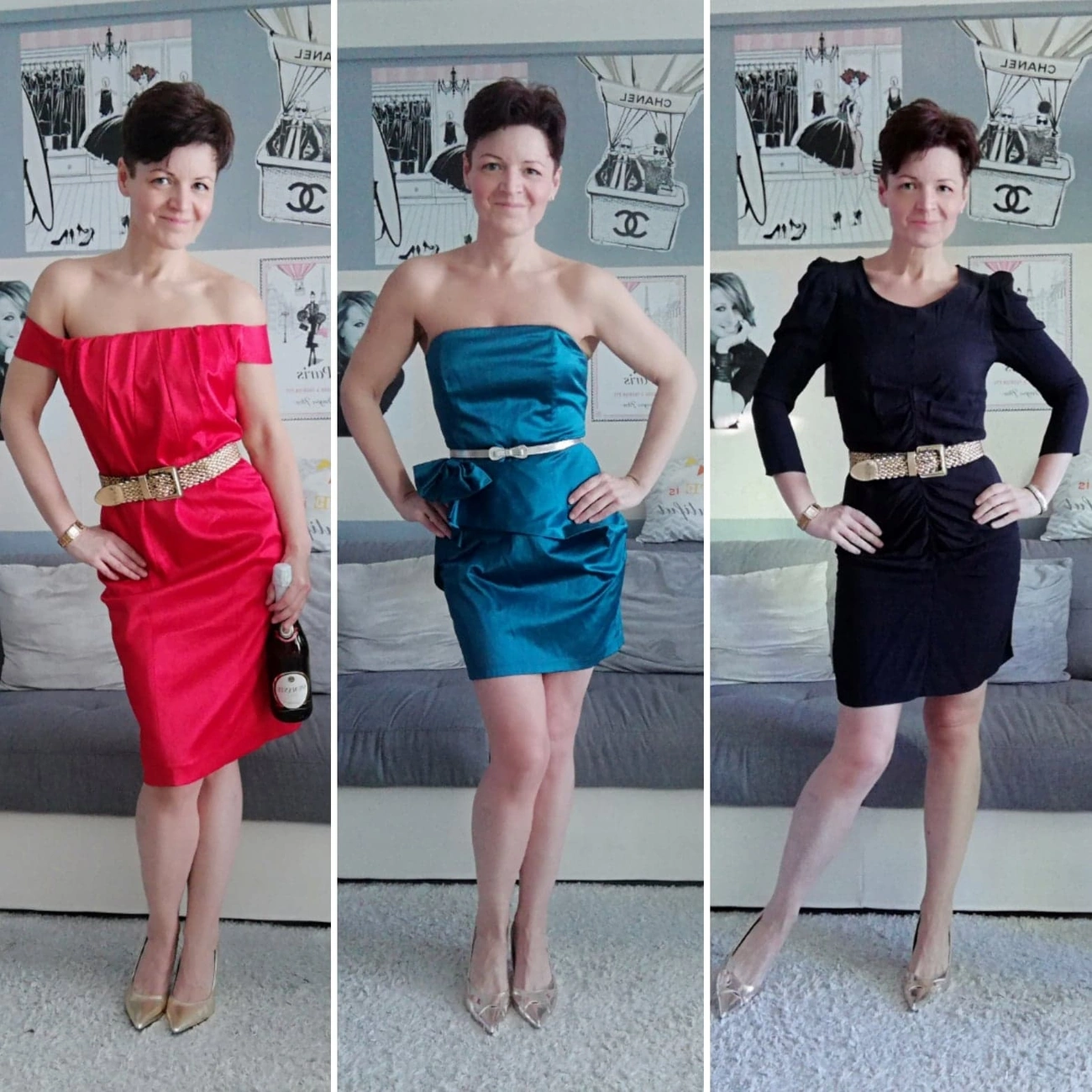 A kifutókon látni lehet még féloldalas megoldásokat: óriási arany vagy színes fülbevalót, de csak az egyik fülben, vagy csak az egyik váll van ki a ruhából.