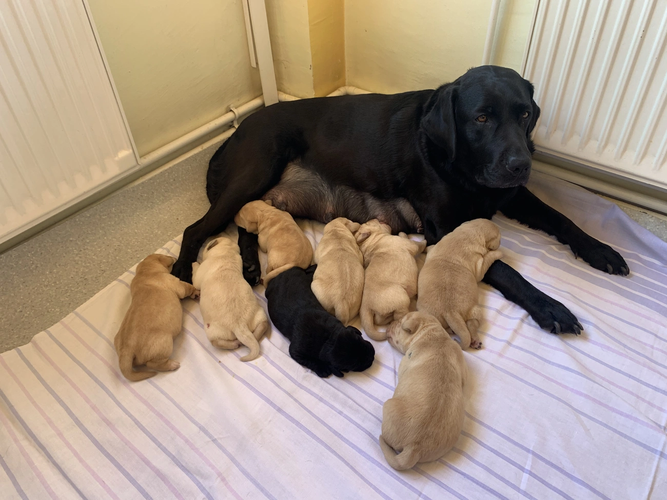 „Nagyon röviden a színt két gén két allélja határozza meg, egyiket anyai oldalról kapja a kölyök, másikat apai oldalról. A fekete domináns a sárgával és a barnával szemben, tehát ha bármelyik oldalról feketét kap, fekete lesz, de van benne sárga/barna allél is. Ha a fekete szuka sárga hordozó, mint Calgary, akkor a kölykök kaphatják bármelyiket, viszont apától csak sárgát, mert neki csak az van, mivel sárga. Ebben az alomban úgy alakult, hogy csak egy kölyök kapta az anyától a fekete allélt, a többi a sárgát” – mondja Komondi Piroska, a Baráthegyi Vakvezető Kutya Iskola szakmai vezetője.