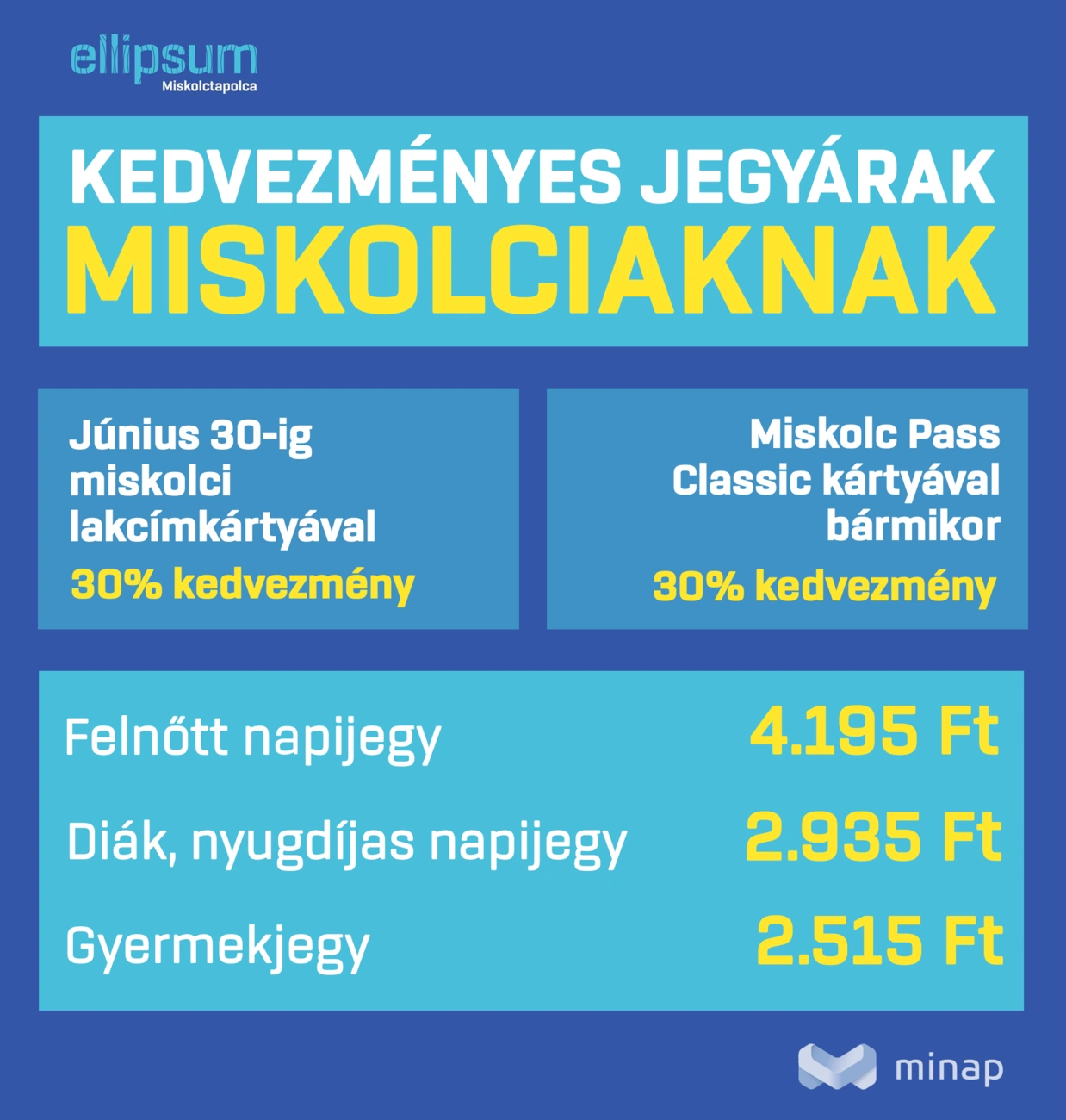 A nyitás napjától 30 százalék kedvezményt kapnak a miskolci lakcímkártyával rendelkezők az időkorlát nélküli jegyekre, egészen június 30-ig.