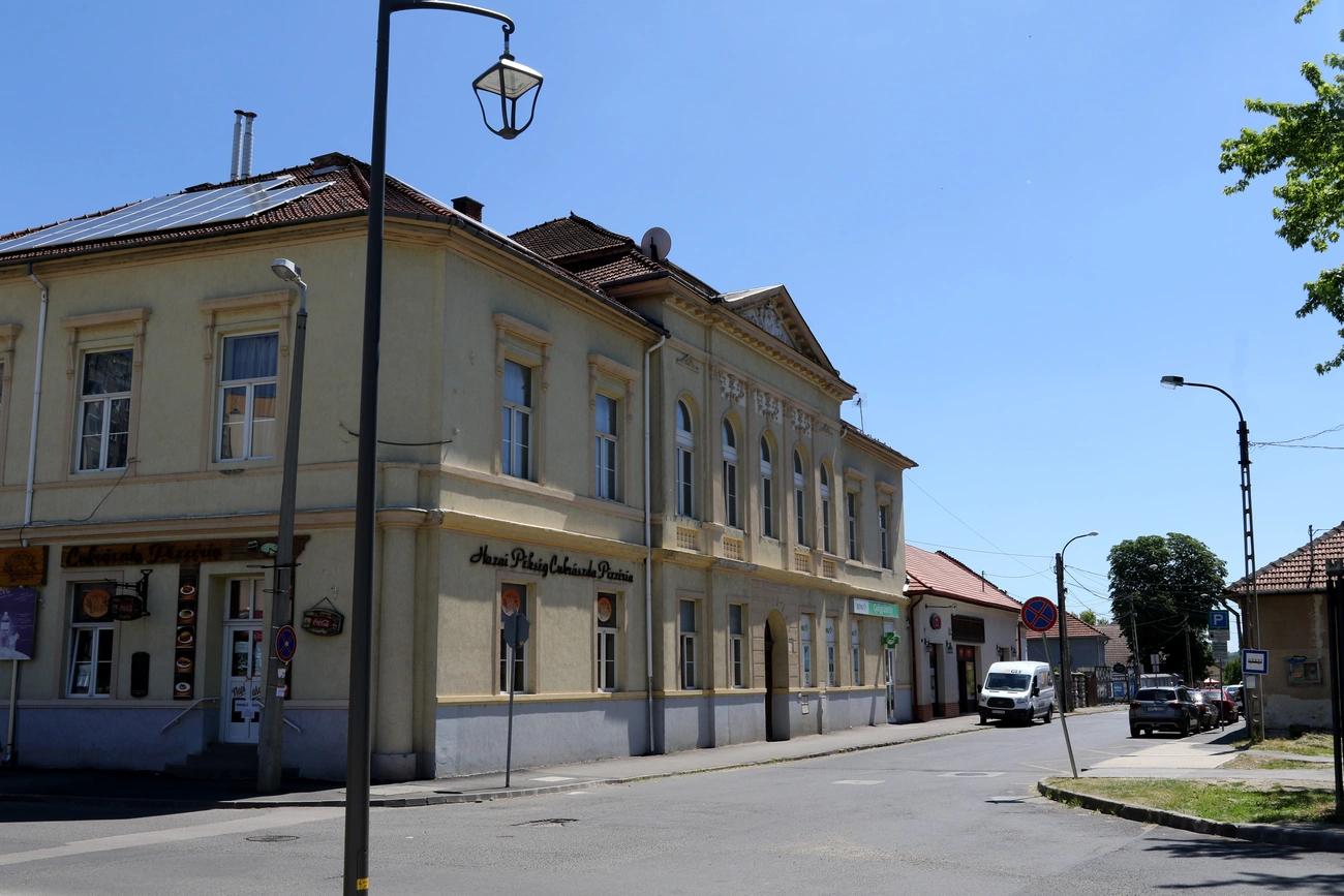 A kép jobb sarkán álló földszintes épületben volt – mások mellett – a Vendéglő az Arany Szarvashoz. A községháza homlokzatán a település címere az 1990-es évek végén is látható volt, de ekkor már többféle funkciója volt az építménynek.