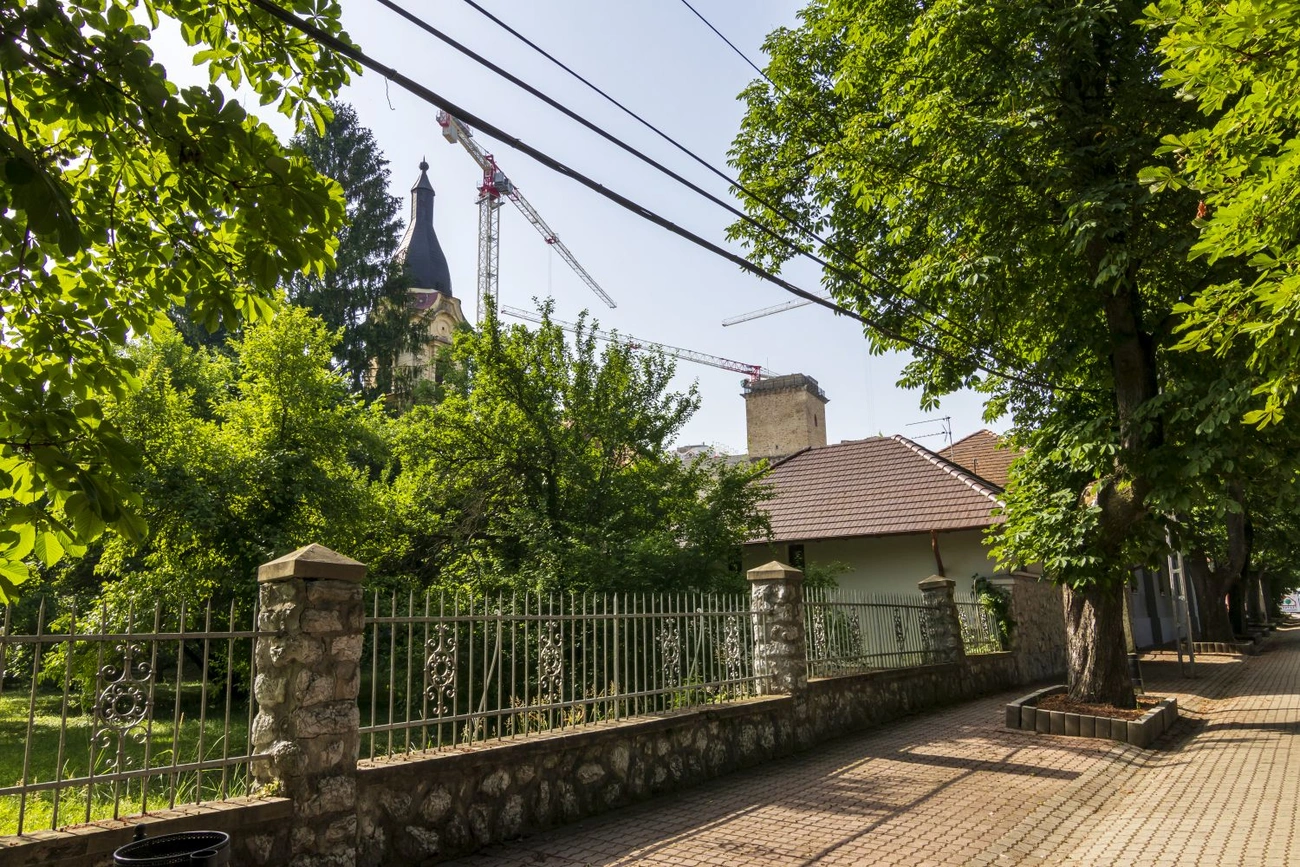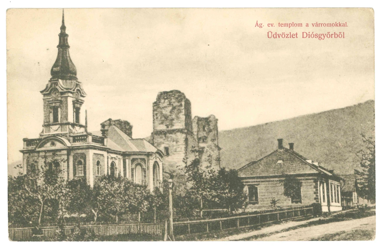 A képeslap a diósgyőri evangélikus templomot, háttérben a diósgyőri várromot, valamint a Vár utca egy kis szegletét ábrázolja.
