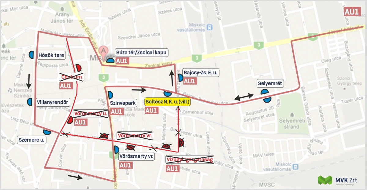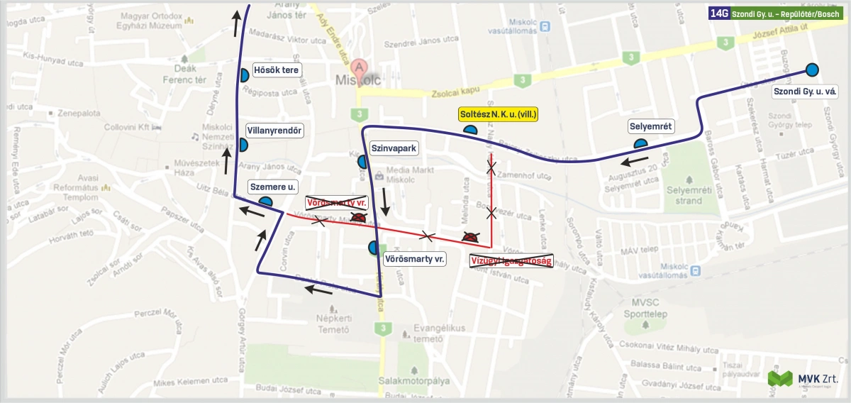 A korábbi Centrum végállomás helyett, a Villanyrendőr megállóhely a járat új ideiglenes végállomása, ezért a Villanyrendőrtől az Auchan Borsod áruház felé a járat megállóhelyei: