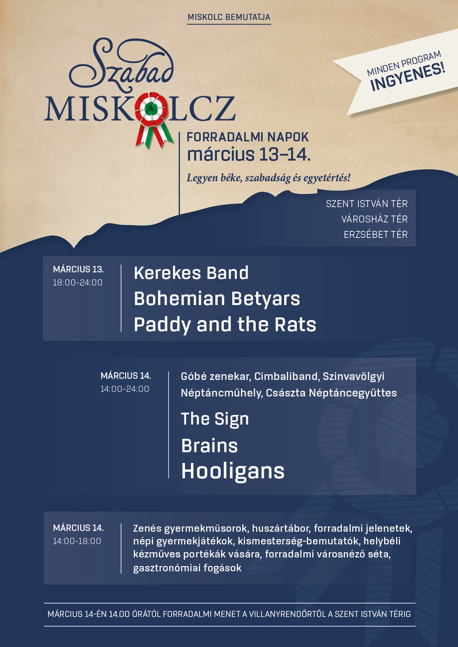 Szabad Miskolcz nevet kapta az a programsorozat, amelyet Miskolc március 13-14-én rendez meg, és amely egyfajta előfutára a városban már megszokott március 15-i hivatalos megemlékezéseknek. A rendezvény célja, hogy visszahozza azt a hangulatot, találkozási és közös ünneplési lehetőséget, amelyre a koronavírus-világjárvány miatt az elmúlt két év nem adott lehetőséget.