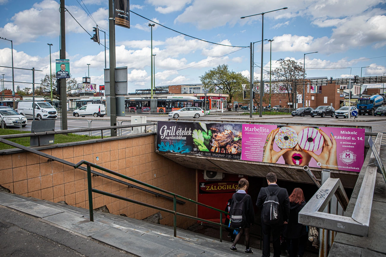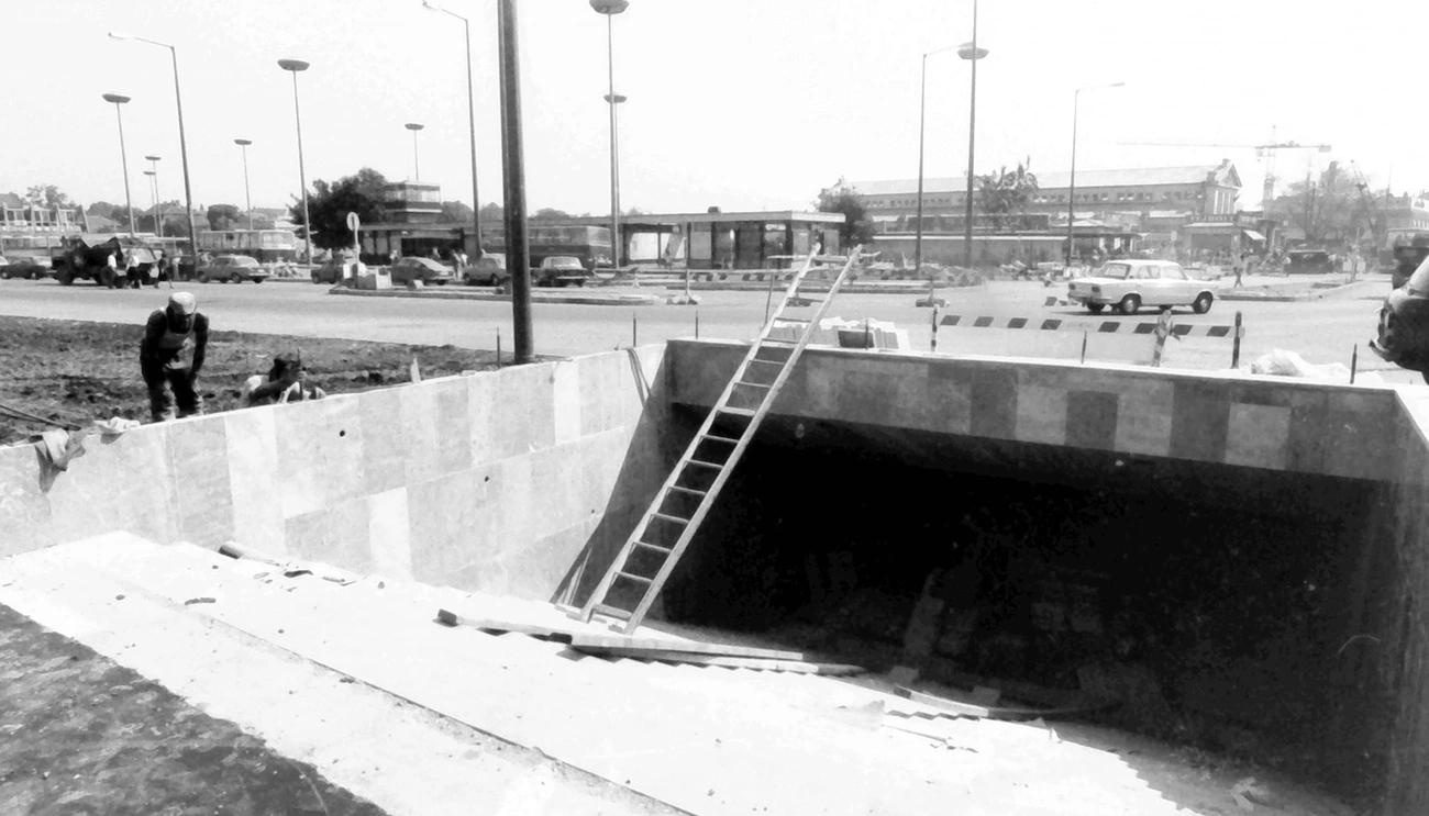 A régi és az új kép előterében is az Búza téri aluljáró látható, annak is a Centrum felőli lejárata. Források szerint az aluljárót 1979-ben adták át, kivitelezője a KÉV-METRO nevű szocialista vállalat volt. A fekete-fehér felvételen már nagyjából a mai állapotok láthatóak, első ránézésre csupán a jellegzetes korlátok hiányoznak, illetve a manapság a lejáratokat meghatározó tarka hirdetések. Látszik még a felvételeken a Miskolc Városi Közlekedési Zrt. (akkor Miskolci Közlekedési Vállalat) Búza téri állomásépülete is, mely a hatvanas évek közepén létesült. Minkét felvételen jól látható továbbá a Búza téri vásárcsarnok is. A műemléket Wellisch Andor és Münnich Aladár tervei alapján építették 1926-ban. A második világháborúban, az 1944. június 2-i bombázás során a vásárcsarnok is súlyos károkat szenvedett, de később helyreállították. A vásárcsarnok legutóbb másfél évtizede esett át teljes rekonstrukción és bővítésen, mai formájában 2008-ban adták át.