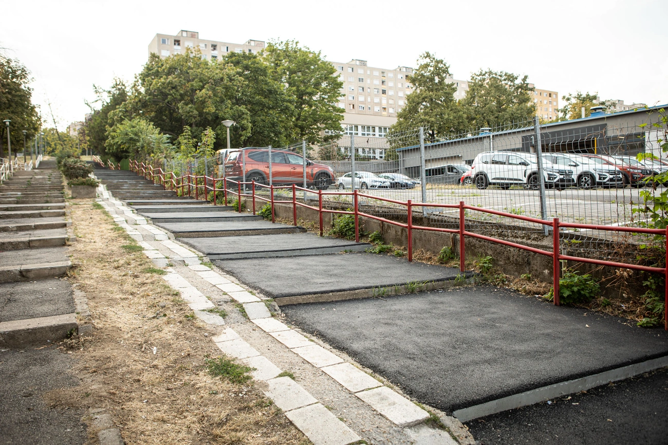 Rendkívül balesetveszélyes volt ez a rész, mert már látni sem lehetett a lépcsőfokokat, szétporladt. A Középszer Úti Óvoda vezetése és a szülők emiatt szorgalmazták a megjavítását, mivel az óvodások bármikor eleshettek, megsérülhettek. A beruházás összköltsége 5 millió forint volt és 300 négyzetméter a lépcsőfelület. A betonozással, aszfaltozással megvalósult a felújítás első üteme.