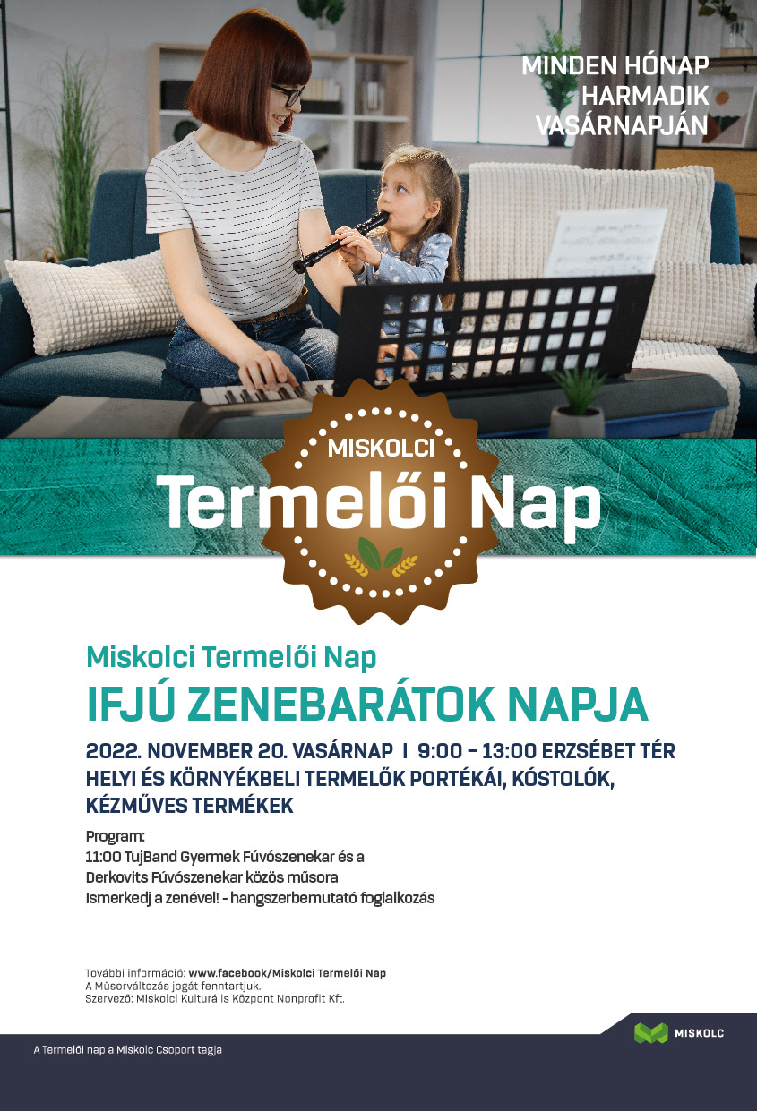 Az Ifjú Zenebarátok Nemzetközi Szövetsége (Jeunesses Musicales International - JMI) 1968-ban tartott kongresszusának határozata alapján minden év november 20-án az ifjú zenebarátok világnapját tartják, így mi is erre emlékezhetünk. Célja, hogy a fiatalok életébe meghatározó szerepet töltsön be a zene, ami segíti őket abban, hogy kiegyensúlyozott emberekké váljanak, ugyanis a zene kitűnő hatással van a testre és lélekre, segíti a logikus gondolkodást. A mostani termelői napon ebbe engedünk egy kis betekintést vendégeinkkel – invitál a különleges élményre Tamás Krisztián, az MKK - Miskolci Kulturális Központ Nonprofit Kft. kommunikációs és marketing ügyintézője.