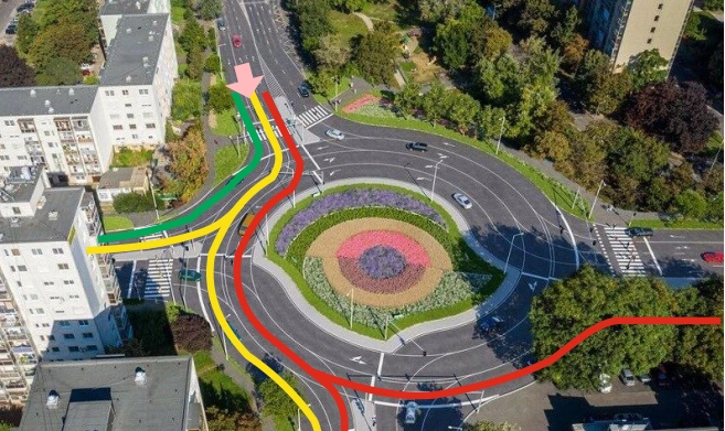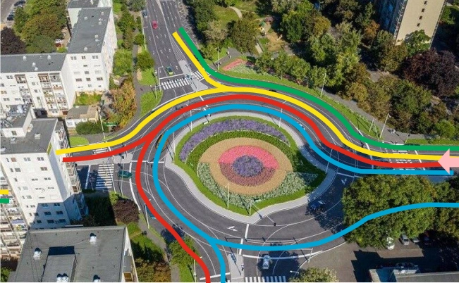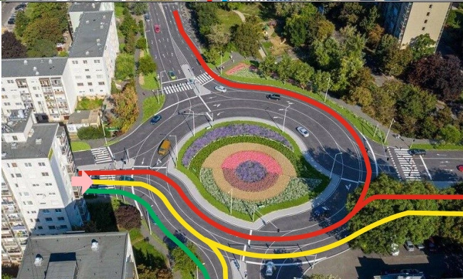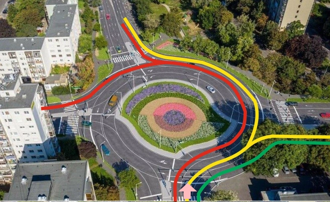 - "Ha legszélső sávban mész be, akkor az első kijárat legszélső sávjában mész ki az első kijáraton. Ha egyel beljebb mész be, akkor az első kijárat belső sávjában, vagy a második kijárat külső sávjában mész ki. Ha még egyel beljebb mész be, akkor az első kijáraton nem tudsz kimenni, de második belsőjébe és a harmadik külsőjébe ki tudsz menni. A körforgalomban nem lehet sávot váltani, így előre tudnod kell, hogy merre szeretnél menni. Ha az Y híd felől jössz akkor 4 sávos lesz a bevezető. A legbelső sáv visszaforgat mert ott 4 sáv van.