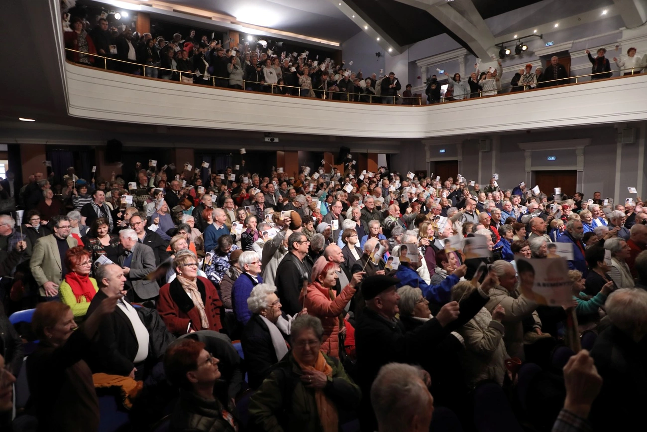 Mintegy negyedórás csúszással indult a rendezvény, annyi érdeklődő érkezett ugyanis a Művészetek Házába, hogy a szervezőknek végül már a színpadon is pótszékeket kellett elhelyezniük, így több tucatnyian a DK prominensei - országgyűlési és önkormányzati képviselők, az árnyékkormány több tagja - mellől, mögül hallgathatták meg a felszólalókat.
