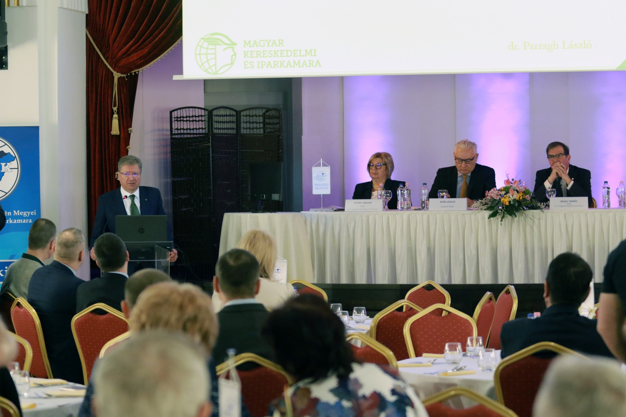 A küldöttgyűlés népes hallgatóságának a rendezvény első előadója Parragh László, a Magyar Kereskedelmi és Iparkamara (MKIK) elnöke a világ- és benne a magyar gazdaság helyzetét vázolta, különös tekintettel a beláthatatlan kimenetelű orosz-ukrán háborúra és a velejáró szankciós politikára, és ezek gazdasági következményeire. Kiemelte, hogy ezen külső hatások miatt Magyarország a gazdasági reorganizáció szélén áll, a kialakult energiaválság a gazdaságpolitika, benne a fiskális és monetáris politika összehangolását, az iparpolitika újjászervezését igényli, az infláció letörésének érdekében.