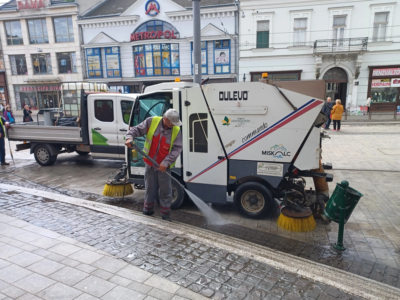 A télen használt szóróanyagot nagyteljesítményű seprűgépekkel szedték össze. Ezek a gépek a kinyúló keféknek köszönhetően a legapróbb helyekre is beférnek, de mellettük utcaseprők is segítik a munkát. A port és a szemetet összeseprik, gyomlálnak. A gépek - a téli szóróanyag - mellett - a galambürüléket is letakarítják a járdákról a főutca teljes hosszán.