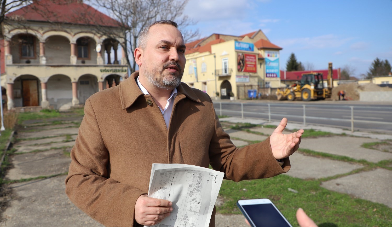 Szopkó Tibor a Hejőcsabai Gyógyszertár előtt a látványtervekkel a kezében. Fotók: Mocsári László
