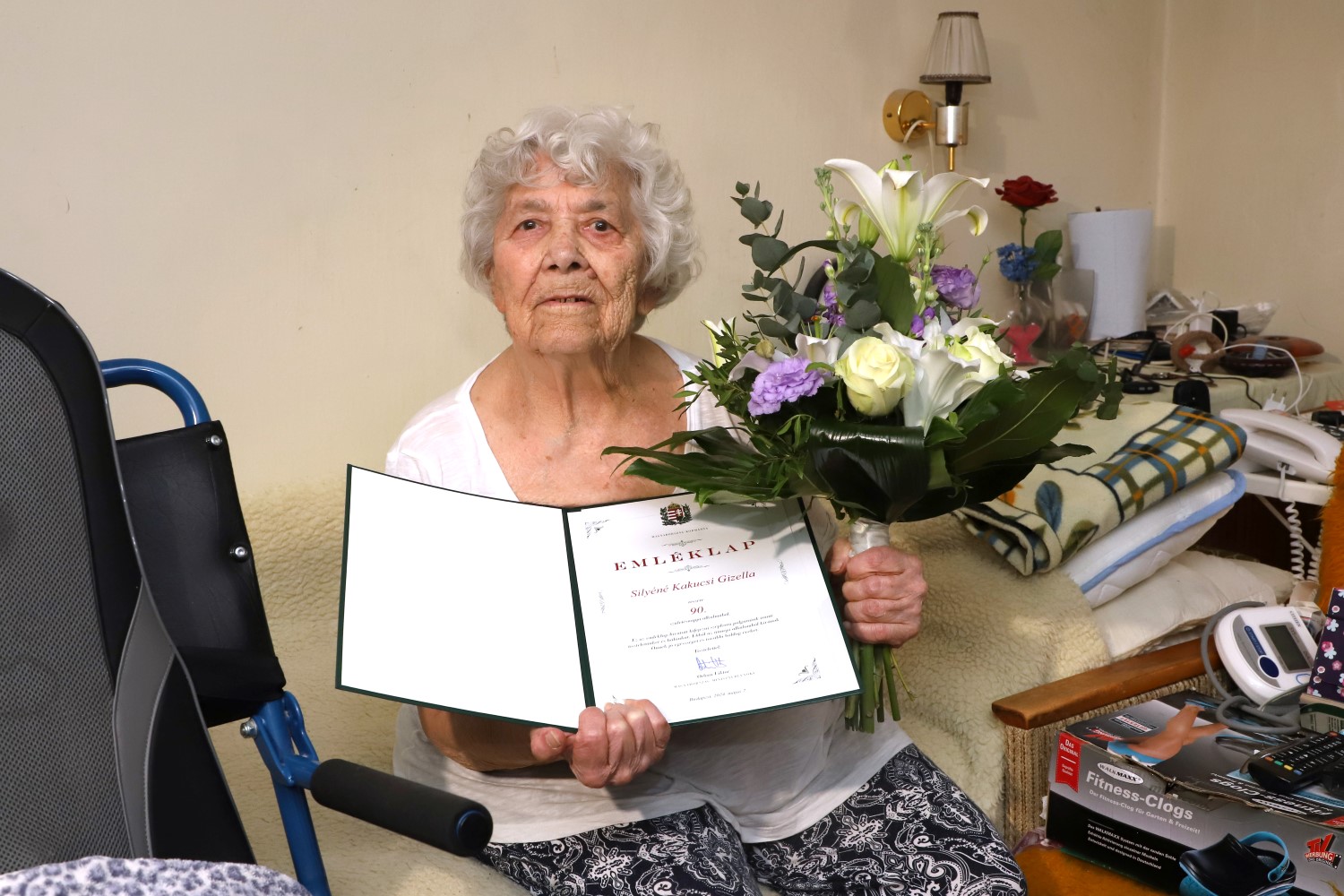 A polgármesteri hivatal összes dolgozója és Miskolc polgármestere nevében köszöntötték fel pénteken a 90 éves Silyéné Kakucsi Gizellát születésnapja alkalmából Rácz Ádám utcai otthonában.
