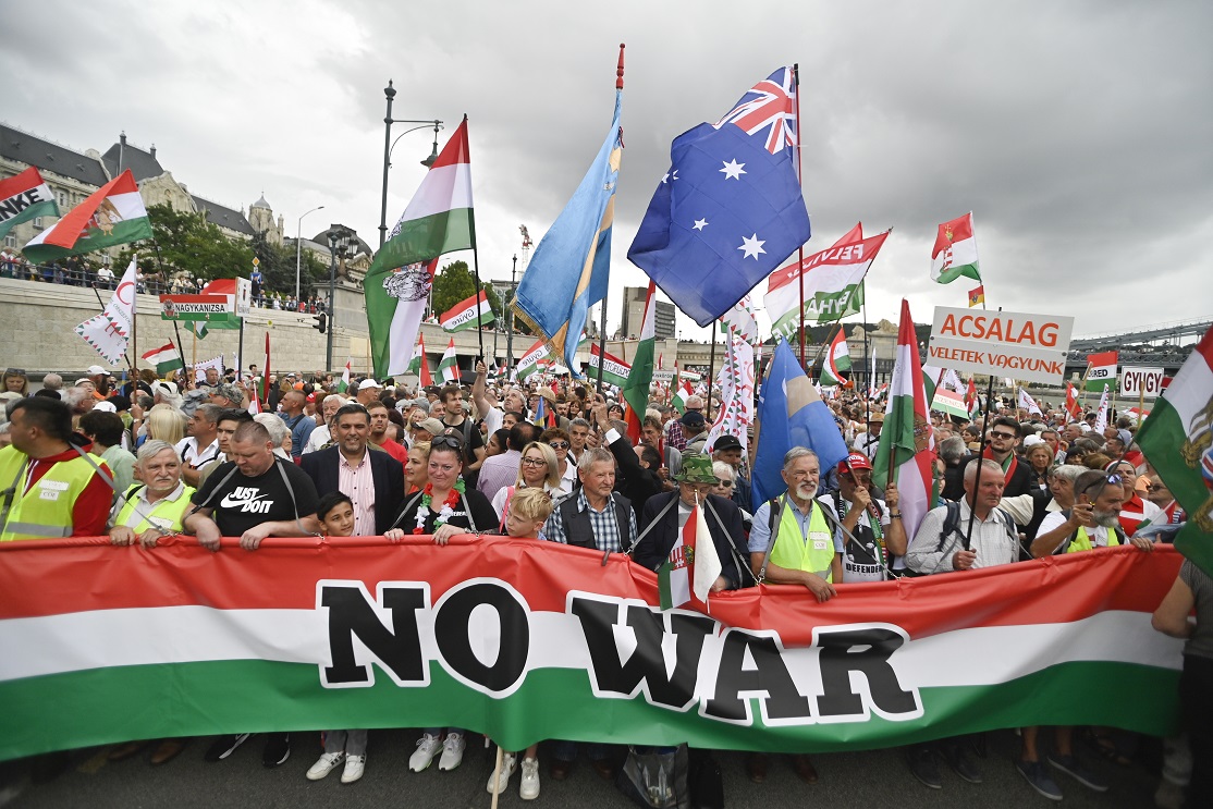 A résztvevők egy NO WAR feliratú molinó mögött sorakoztak fel az MTI tudósítása szerint. A molinó mögötti tömegben feltűnt Deutsch Tamás, a Fidesz-KDNP EP-listavezetője, Semjén Zsolt miniszterelnök-helyettes, Győrffy Balázs, a Nemzeti Agrárgazdasági Kamara elnöke, ifj. Lomnici Zoltán a CÖF-CÖKA szóvivője, Bencsik András, a Demokrata főszerkesztője, Bayer Zsolt publicista, Fricz Tamás politológus, Csizmadia László, a CÖF alapítója, Stefka István újságíró, Széles Gábor vállalkozó, Fásy Ádám előadóművész, Pataky Attila énekes is.