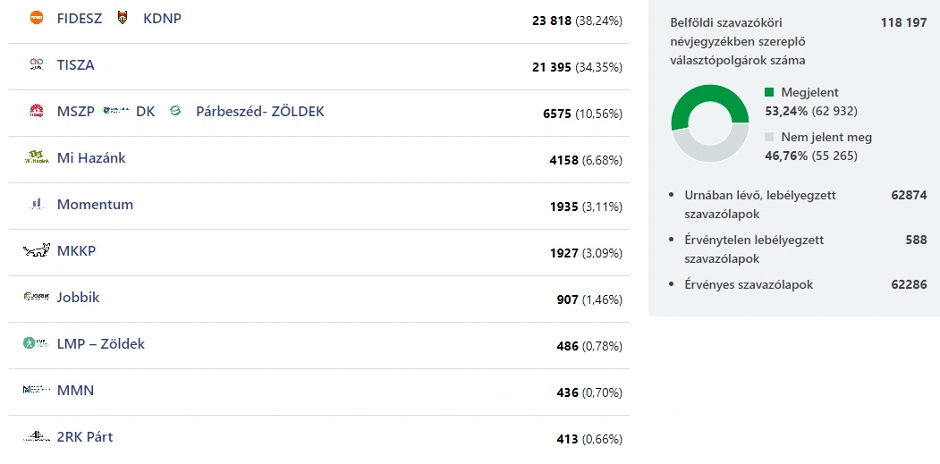A Fideszre a vármegyeszékhelyen 23 818-an adták le a voksukat, ami a szavazók 38,24 százalékát jelenti, míg a Tiszára 21 395-en, tehát az urnához járulók 34,35 százaléka.