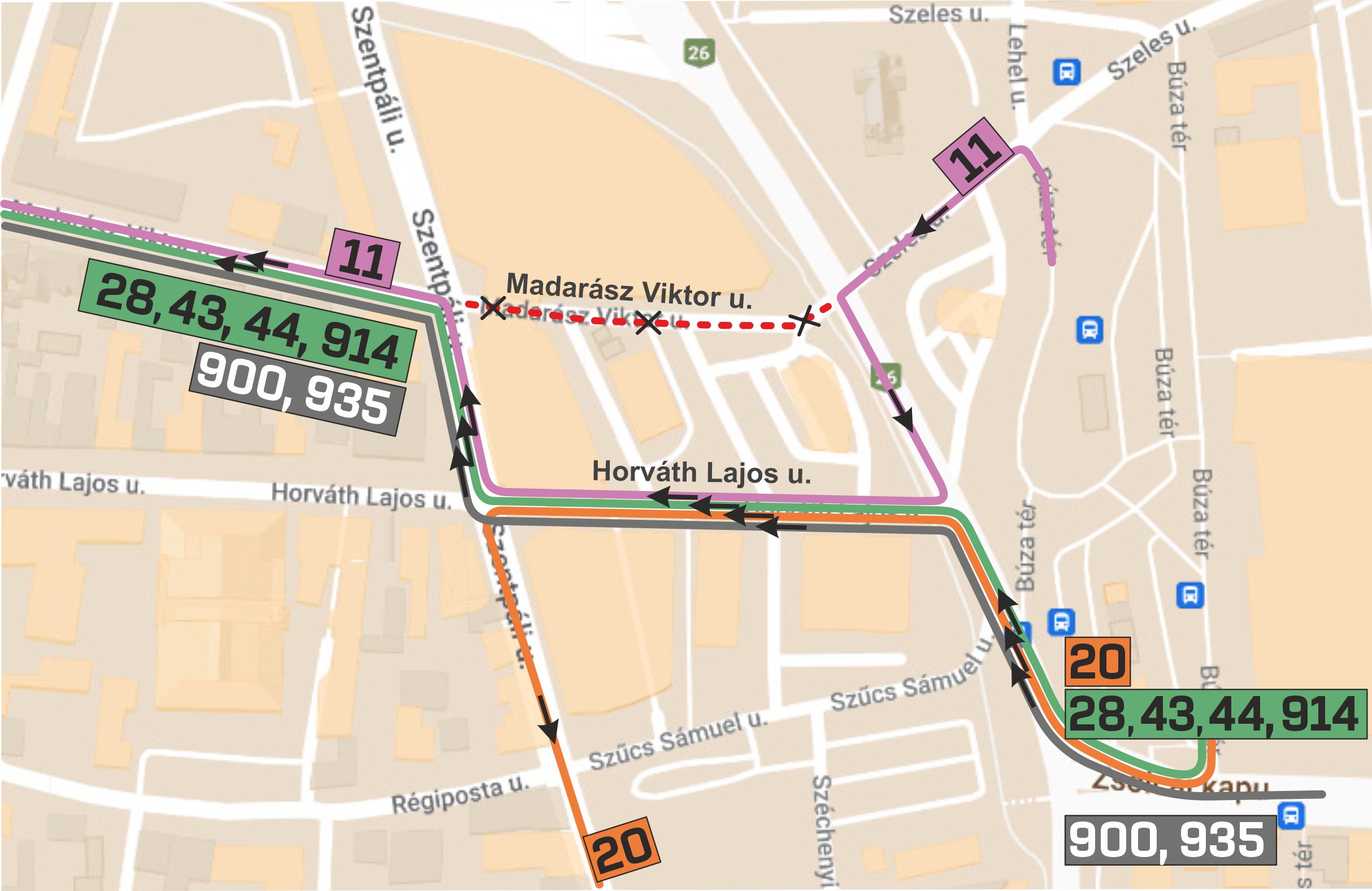 Június 30-án, vasárnap 0 és 5 óra között lezárják a Madarász Viktor utca egy részét, emiatt terelt útvonalon közlekednek a 11-es, a 20-as, a 28-as, a 43-as, a 44-es, a 900-as és a 935-ös járatok. Az útlezárás csak a járatok útvonalát érinti, a megállóhelyeik változatlanok maradnak.