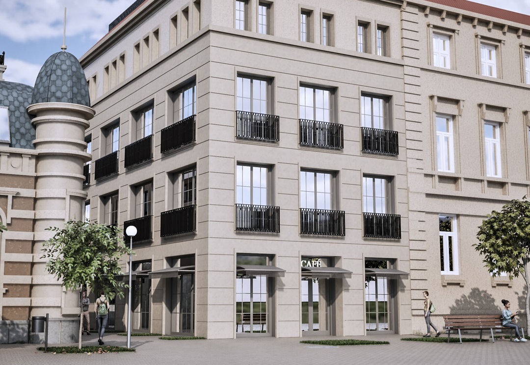 A külső burkolatok megformálásával kapja meg az épület azokat a klasszicizáló stílusjegyeket, amelyekkel igazodik a térhez tartozó többi házhoz. Az objektum fő burkolata a káderezett travertin mészkő, amely egészen felfut a legfelső szintig - írja a bejegyzés.