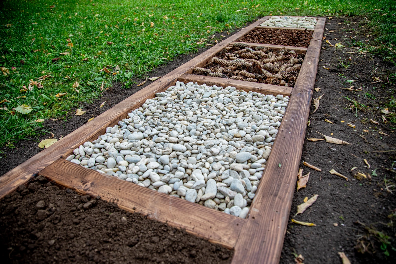 A talp különböző reflexpontjait öt különböző textúrájú anyag stimulálja: folyami kavics (80-100 mm és 30-50 mm átmérőjű), színezett dekormulcs, fenyőtoboz és döngölt föld.