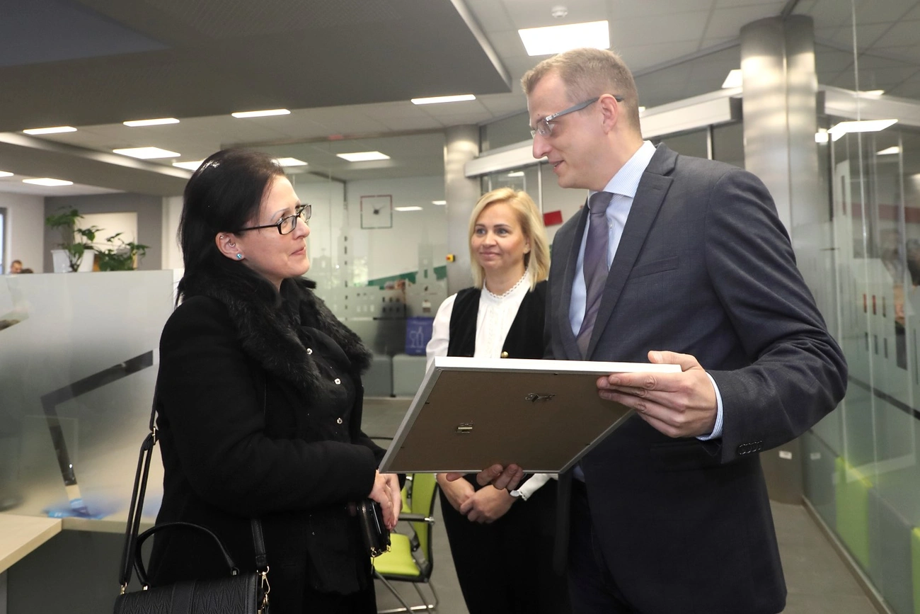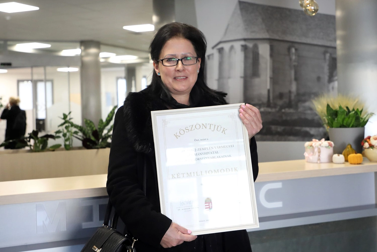 Alakszai Zoltán Borsod-Abaúj-Zemplén vármegyei főispán egy bekeretezett oklevéllel kedveskedett a jeles ügyfélnek, amelyen a főispán aláírása mellett Navracsics Tibor közigazgatási és területfejlesztési miniszter szignója is szerepel. A főispán elmondta, a Borsod-Abaúj-Zemplén Vármegyei Kormányhivatal miskolci járási hivatalának keretén belül működnek a miskolci kormányablakok is, összesen négy, amelyeknek ügyfélforgalma - a nyilvántartásuk alapján - hétfőn érte el a kétmilliót.