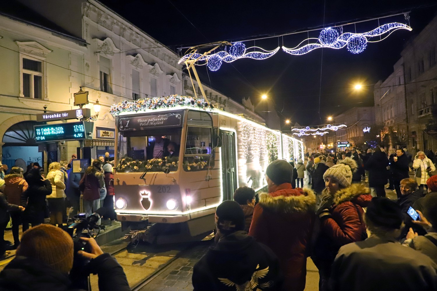 Az ünnepi díszbe öltözött szerelvény advent első vasárnapján, azaz december 1-jén gurult ki először a remízből és az adventi gyertyagyújtás, valamint az Avasi kilátó fényjátéka után settenkedett be komótosan a Szent István térre.