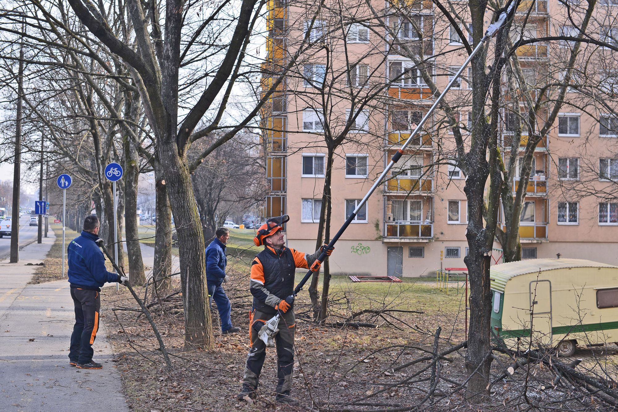 – A feladatot városrészenként, lakótömbönként csoportosítva, egy ütemben teljesítjük – mondta Csordás László. – Így egy-egy helyszínen nagy mennyiségű zöldhulladék keletkezik, melynek az elszállítását három önrakodó teherautóval, három kisebb járművel, valamint egy, a helyszínen magára aprítékoló járműszerelvénnyel végezzük.