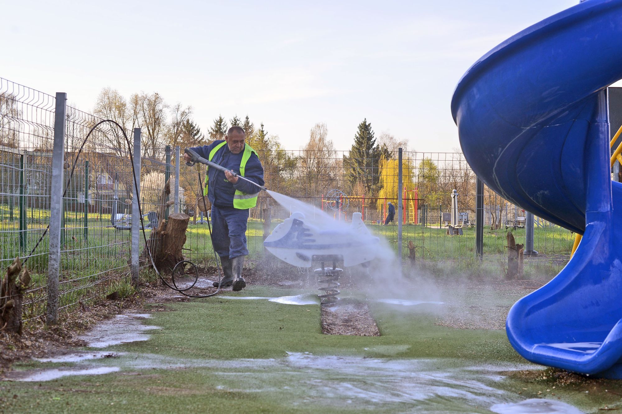 Csütörtök reggel a Szilvás utcai játszótéren takarították a játszóeszközöket a magasnyomású mosóval a Városgazda munkatársai. A terület a kisgyerekes családok egyik kedvenc helye az Avason.