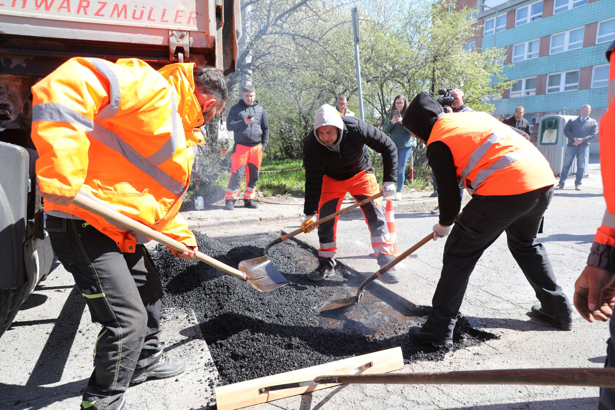 Megtudtuk tőle, hogy a jó idő beköszöntével már meleg, körülbelül 180 fokos aszfalttal történik az útjavítás, emulziós alákezeléssel. A forró aszfaltot egy alaposan kitisztított, a leváló részektől megszabadított és körülvágott üregbe öntik, ahol a szakemberek kézi erővel eligazgatják. A tömörítést végül egy kézi irányítású kisebb, vibrációs úthenger végzi, amit az úgynevezett élzárás követ. Az élzárást jelen esetben egy speciális anyagból készült szalaggal oldják meg, amely gyakorlatilag egybeolvad az aszfalttal, így a beszivárgó víz nem okozhat a későbbiekben problémát ugyanezeken az úthibákon.