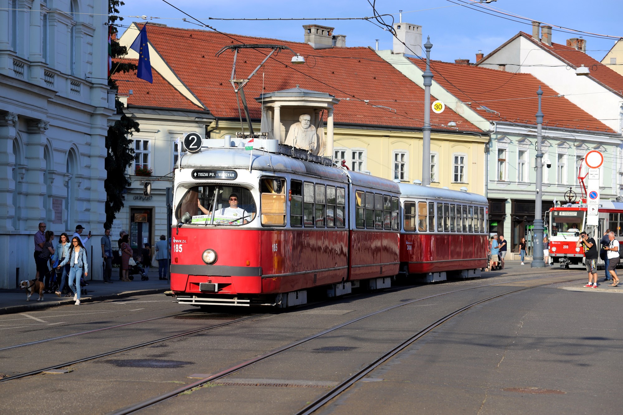 A 100-as pályaszámú FVV villamos a 2-es villamosvonalon (Tiszai pályaudvar – Vasgyár – Újgyőri főtér) közlekedik: