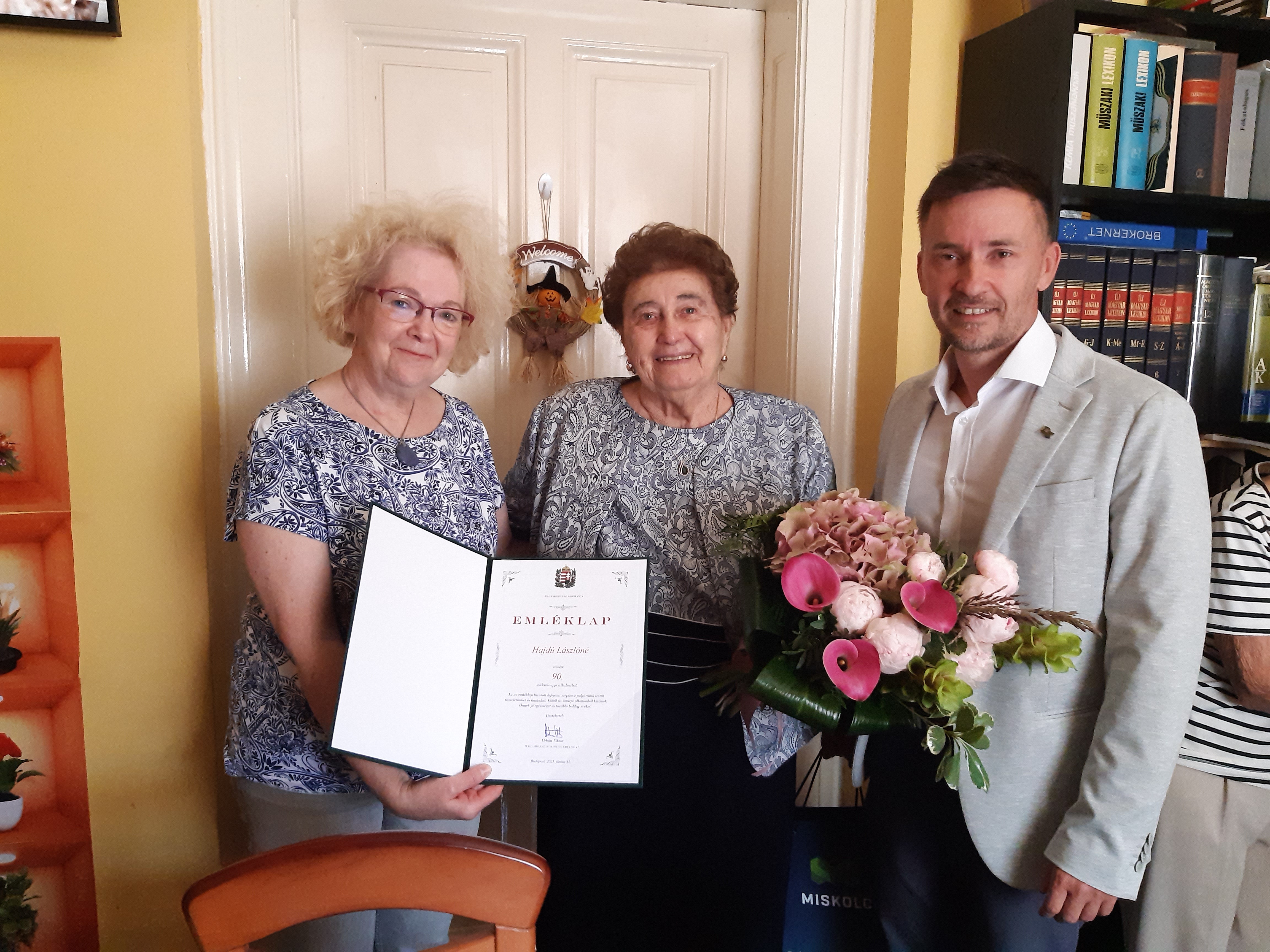 Pakusza Zoltán, a perecesi választókerület önkormányzati képviselője és Szomorné Takács Tünde, a polgármesteri hivatal lakosságszolgálati főosztályának csoportvezetője virággal, bonbonnal és egy miniszterelnöki oklevéllel keresték fel a szépkorú hölgyet, hogy felköszöntsék a jeles nap alkalmából.