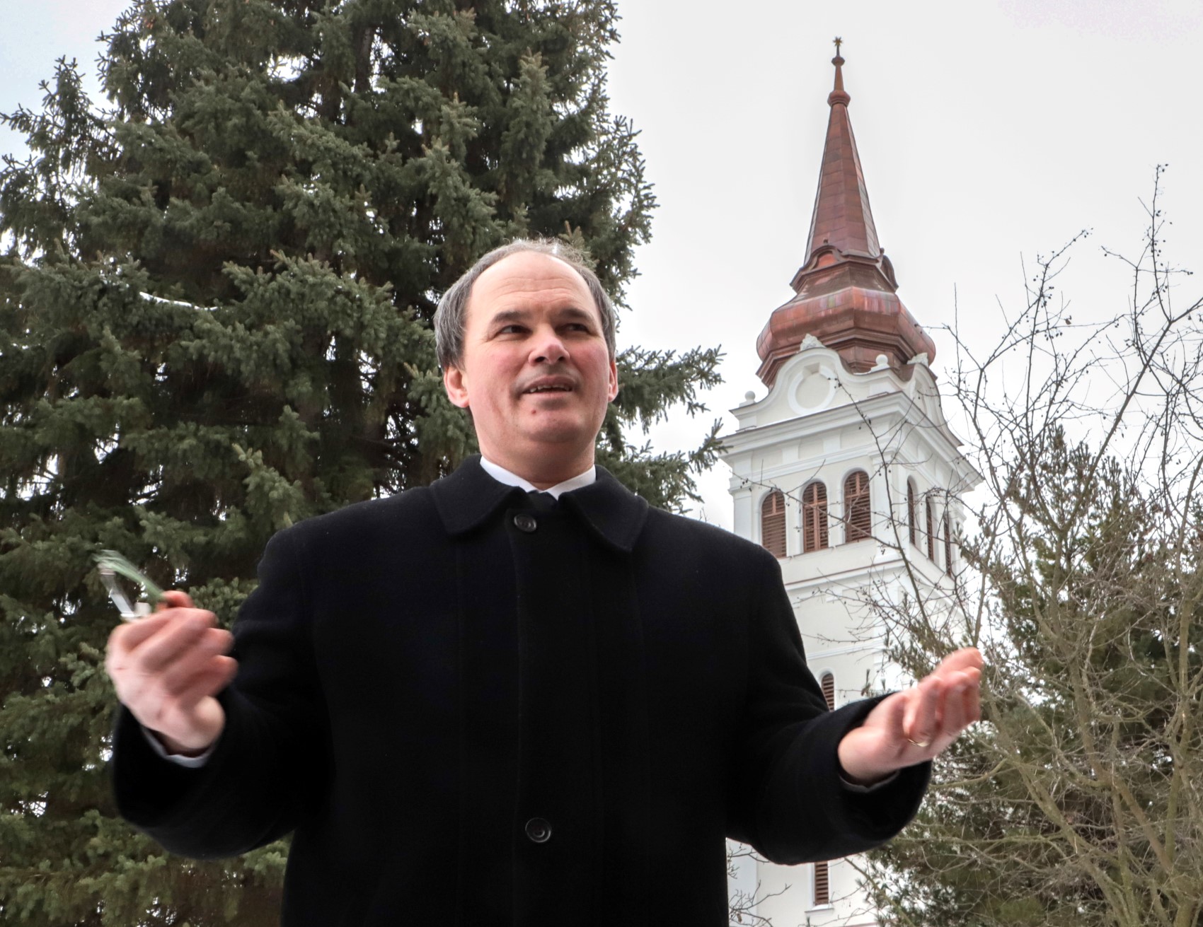 Jobbágy Bertalan hejőcsabai református lelkipásztor a megújult templomtoronnyal. Fotók: Mocsári László