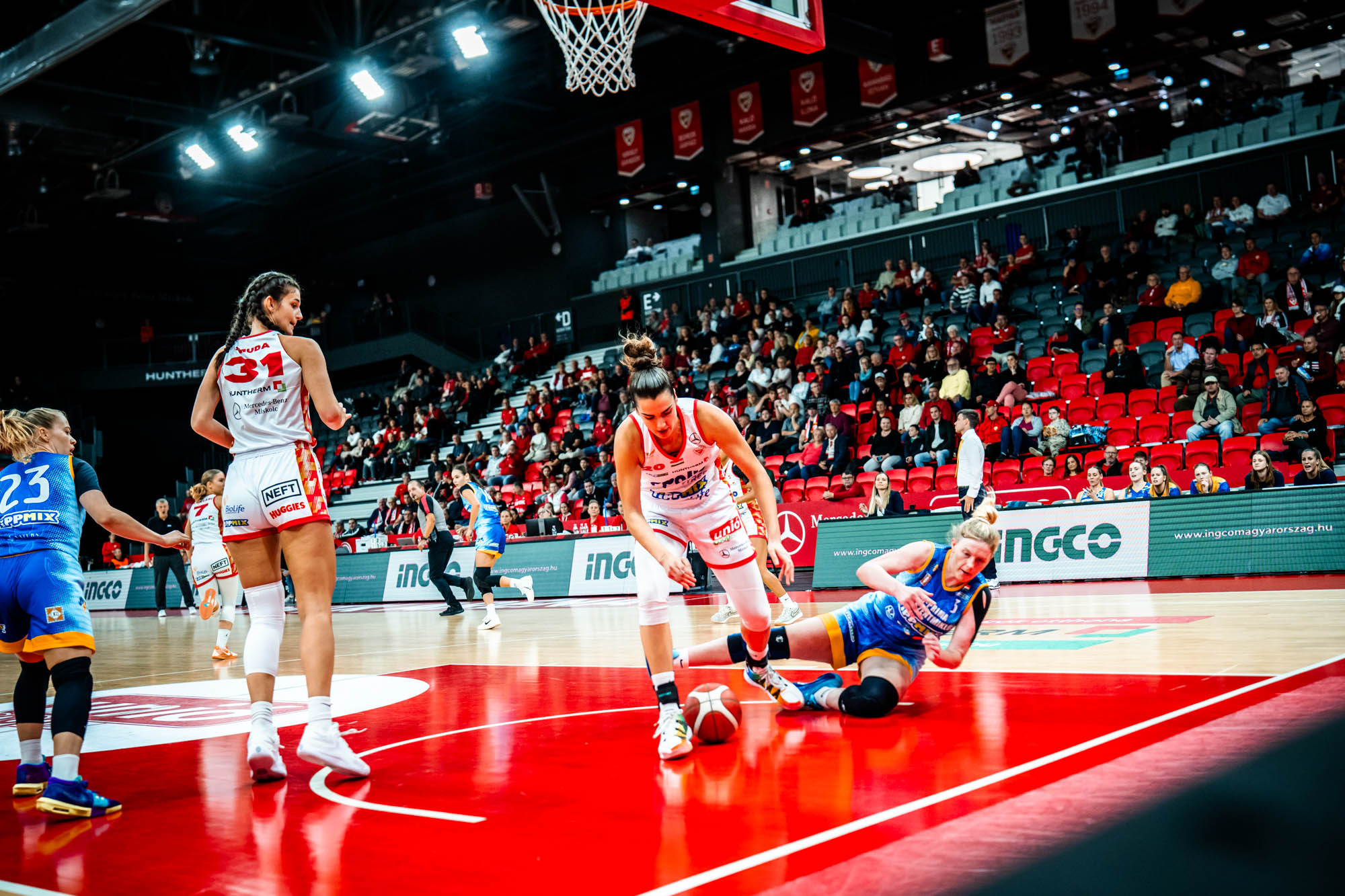 A diósgyőriek a sereghajtó ellen magabiztosan kezdtek, már a 3. percben 10 ponttal vezettek (1-11), és a folytatásban is gyártották a kosarakat. Igaz, a hazaiak is megindultak (11-21), így az első játékrész végén ,,csak” 14 pont volt a fórjuk (15-29). Nem csak ezt a játékrészt, hanem a másodikat is ilyen különbséggel hozták a piros-fehérek, és egy picivel többet termeltek. A közte húszat a 16. percben Kathryn Westbeld hármasával érték el, lépték túl (24-46), a 18. minutában Bella Smuda közeli góljával pedig már 30 volt a csapatok között (24-54). A 13-0-s diósgyőri etap nagyban hozzájárult ahhoz, hogy féltávnál jelentős legyen a különbség a csapatok között (33-61).