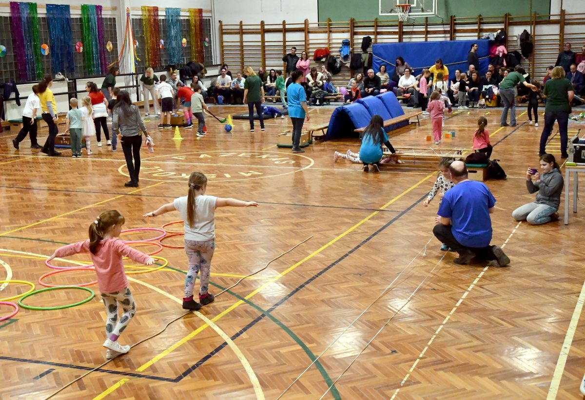 A jelenlegi negyedikesek és a tanítónénik trükkös akadálypályákkal és ügyességi feladatokkal készültek az ovisok számára. Volt olyan állomás, ahol hokiütővel kellett labdát vezetni a bóják között, majd bukfenc következett, amelynél a tanítónők segítettek. Ezután ugrálás várt a gyerekekre, de csak a nyilak által kijelölt irányba. Aki még a kapuba is betalált, jutalmul pacsit kapott.