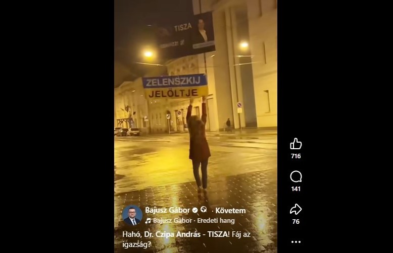 „Annyira nem tetszik az igazság a tiszásoknak, hogy ismét leszaggatták molinóinkat. Továbbra is tartjuk azt a véleményünket, hogy, aki nem a magyar érdekeket tartja szem előtt, hanem külföldi, akár ukrán érdekeket, az bizony Zelenszkij jelöltje. Bármit is gondoljon a Brüsszelben dolgozó Czipa András, vagy Kapitány István, mi meg fogjuk védeni a rezsicsökkentést, meg fogjuk védeni a magyar embereket” – mondja videójában Bajusz Gábor.