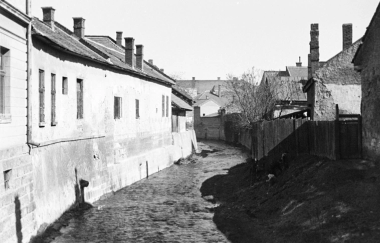 A Szinva-part az Arany János utcát és a Széchenyi utcát összekötő, úgynevezett Royal köz hídjáról kelet felé nézve – fogalmaz a fortepan.hu Kieselbach Tamás 1950-ben készült felvételével kapcsolatban.