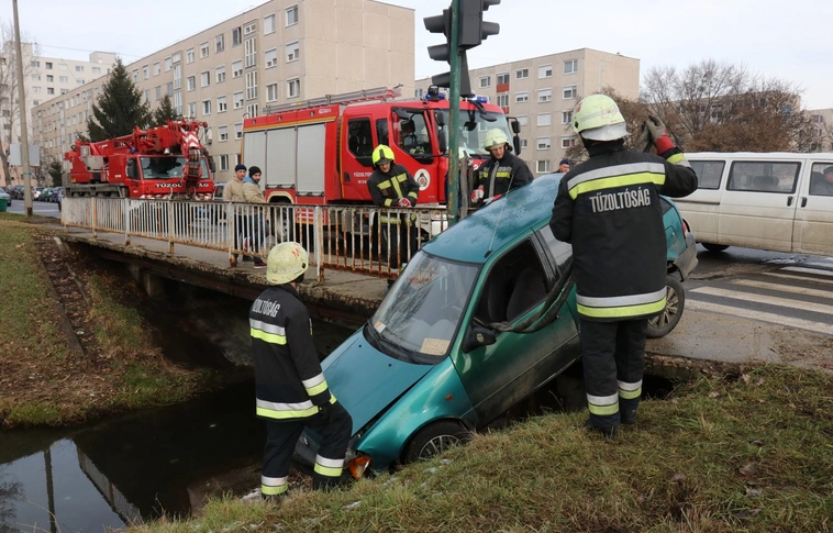 A Kiss Ernő és a Thököly utcák kereszteződésében történt baleset, aminek következtében egy autó átszakította a Szinva-híd korlátját, és lelógott az útról.