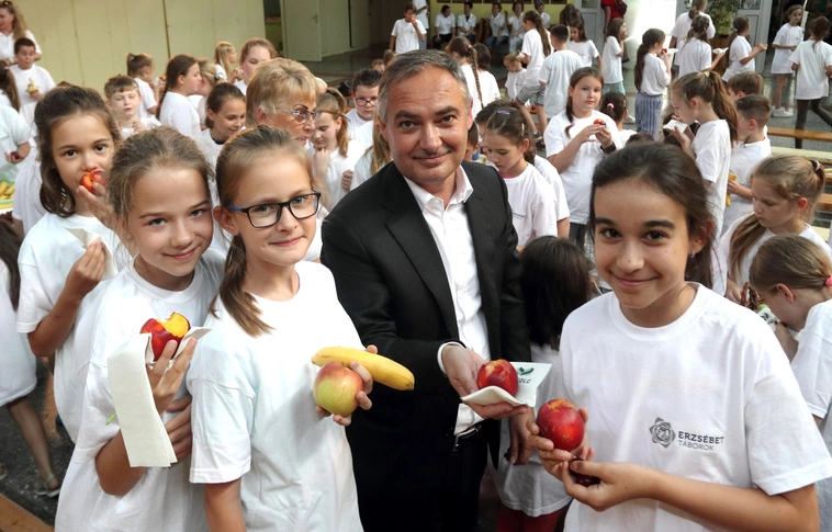 A héten napközis Erzsébet tábort tartanak a Jókai általános iskolában, ahol csütörtökön több mint 100 kisdiáknak osztott ki 50 kilogrammnyi gyümölcsöt Kiss János alpolgármester, és Kovácsné Budai Mária képviselő.